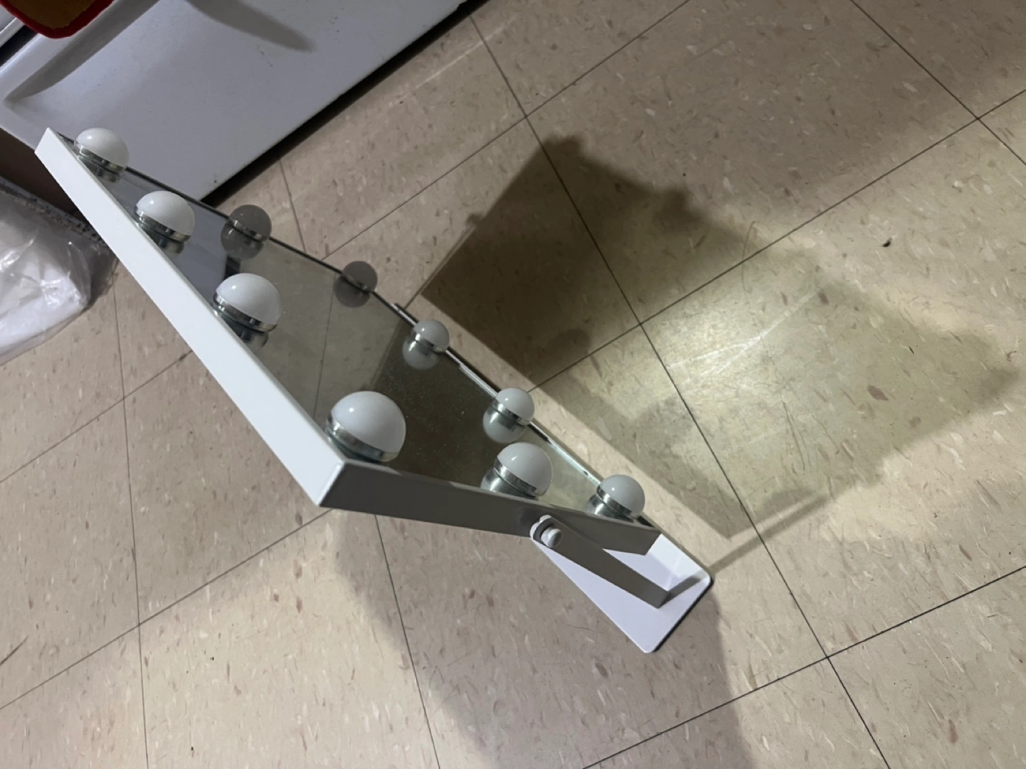 Freestanding vanity mirror. Features eight LED lights. White frame. Adjustable stand.