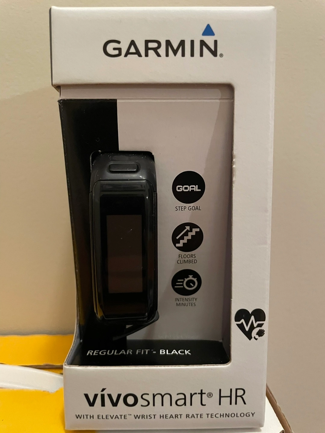 Black Garmin vivosmart HR fitness tracker. Includes Elevate wrist heart rate technology. Tracks steps, floors climbed, and intensity minutes.