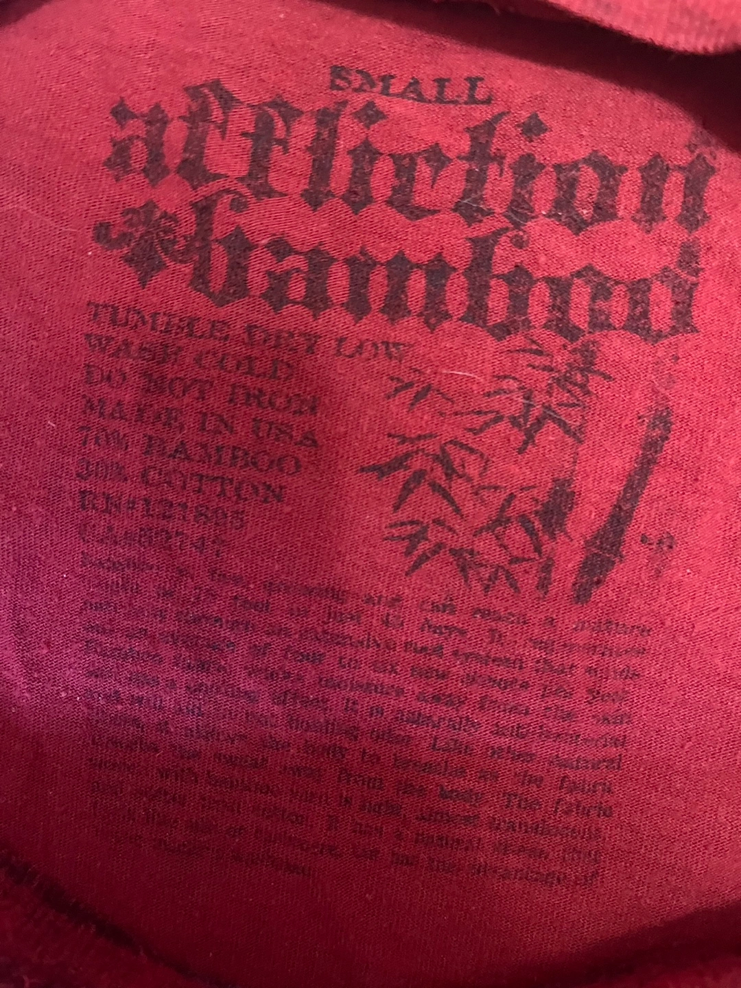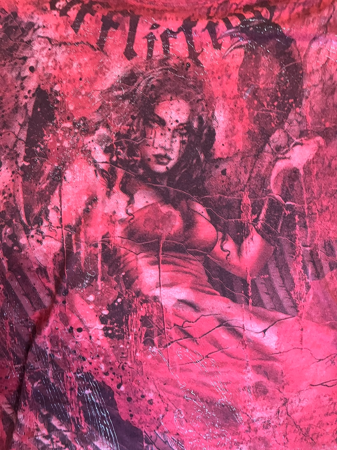 Red graphic tee. Features a dark, gothic-style image of a woman. Made of 100% cotton. Machine wash cold, tumble dry low.