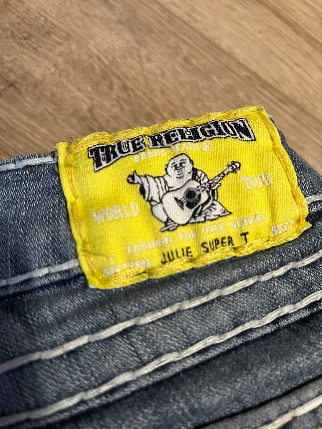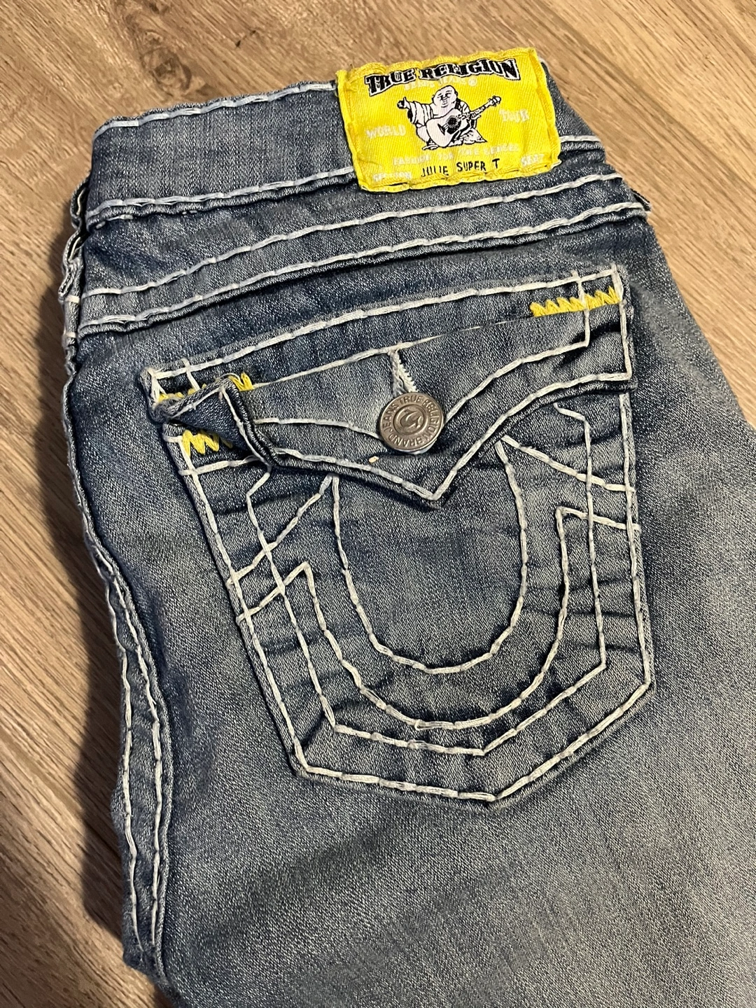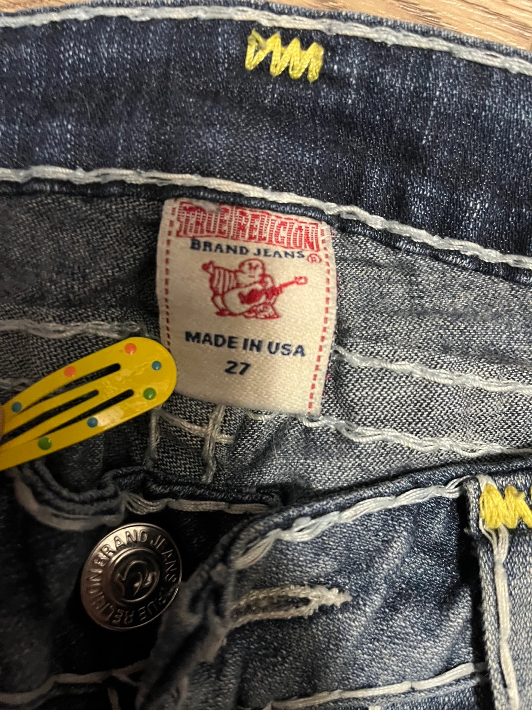 Women's True Religion jeans. Size 27. Light wash denim. Yellow stitching detail. Made in the USA.
