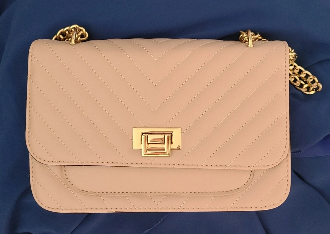 Stylish blush pink crossbody bag. Features gold chain strap and gold clasp. Quilted design. Perfect for everyday use. Brand new, never used. Very spacious!