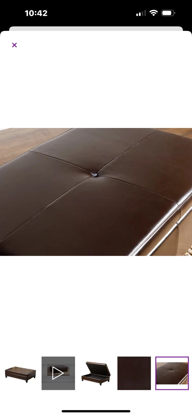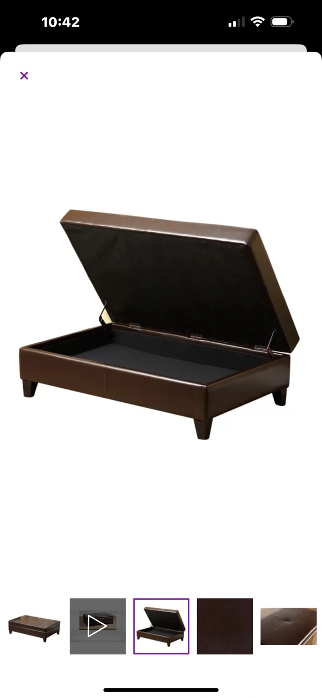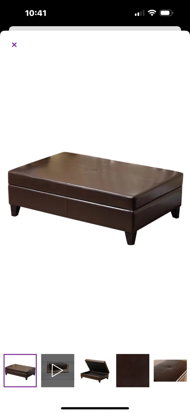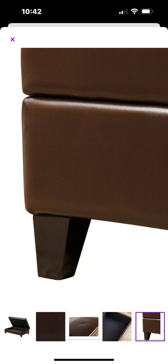 Brown faux leather ottoman. Storage inside. Dark brown legs. Great for extra seating or storage. Need to elevate my living room. Ready to rotate and trade with someone who need it. Really a helpful piece of ottoman. A little burn mark from candle. I took the pic for your reference. In great condition.