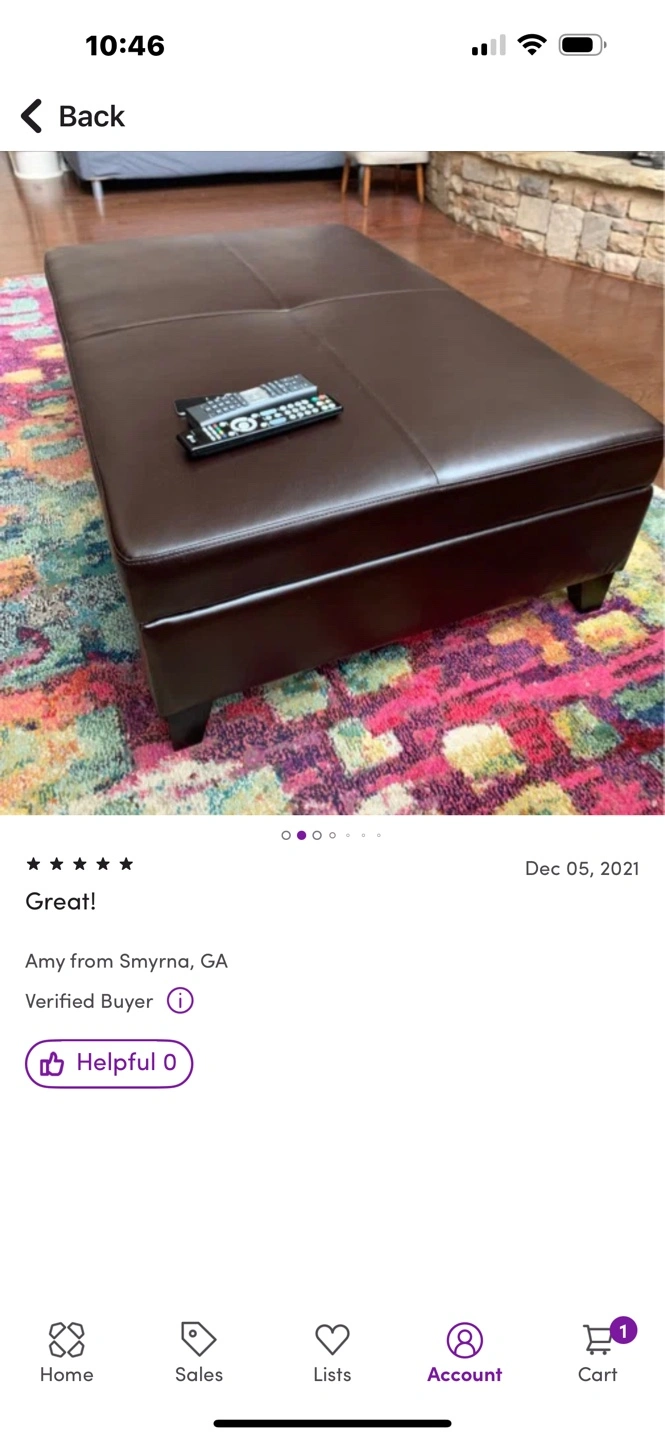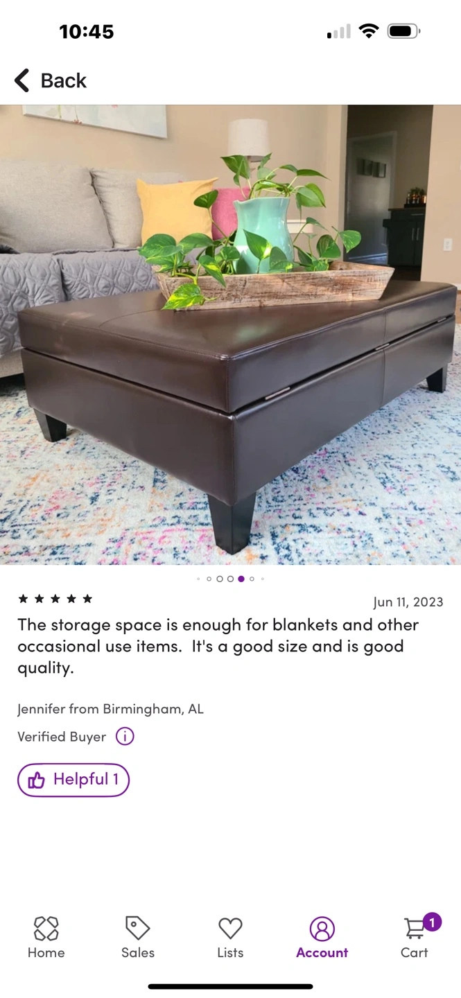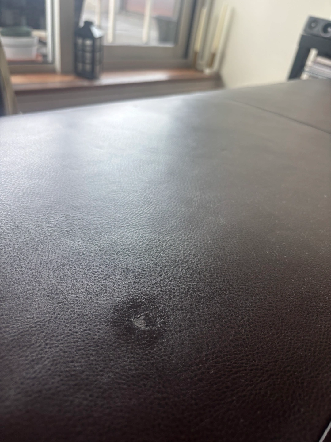 Brown faux leather ottoman. Storage inside. Dark brown legs. Great for extra seating or storage. Need to elevate my living room. Ready to rotate and trade with someone who need it. Really a helpful piece of ottoman. A little burn mark from candle. I took the pic for your reference. In great condition.