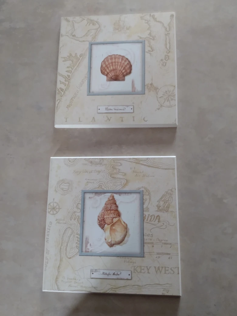 Pair of framed coastal prints. Features antique map backgrounds and detailed shell images. Perfect for beach house or nautical-themed Non Negotiable (Cash pick up)