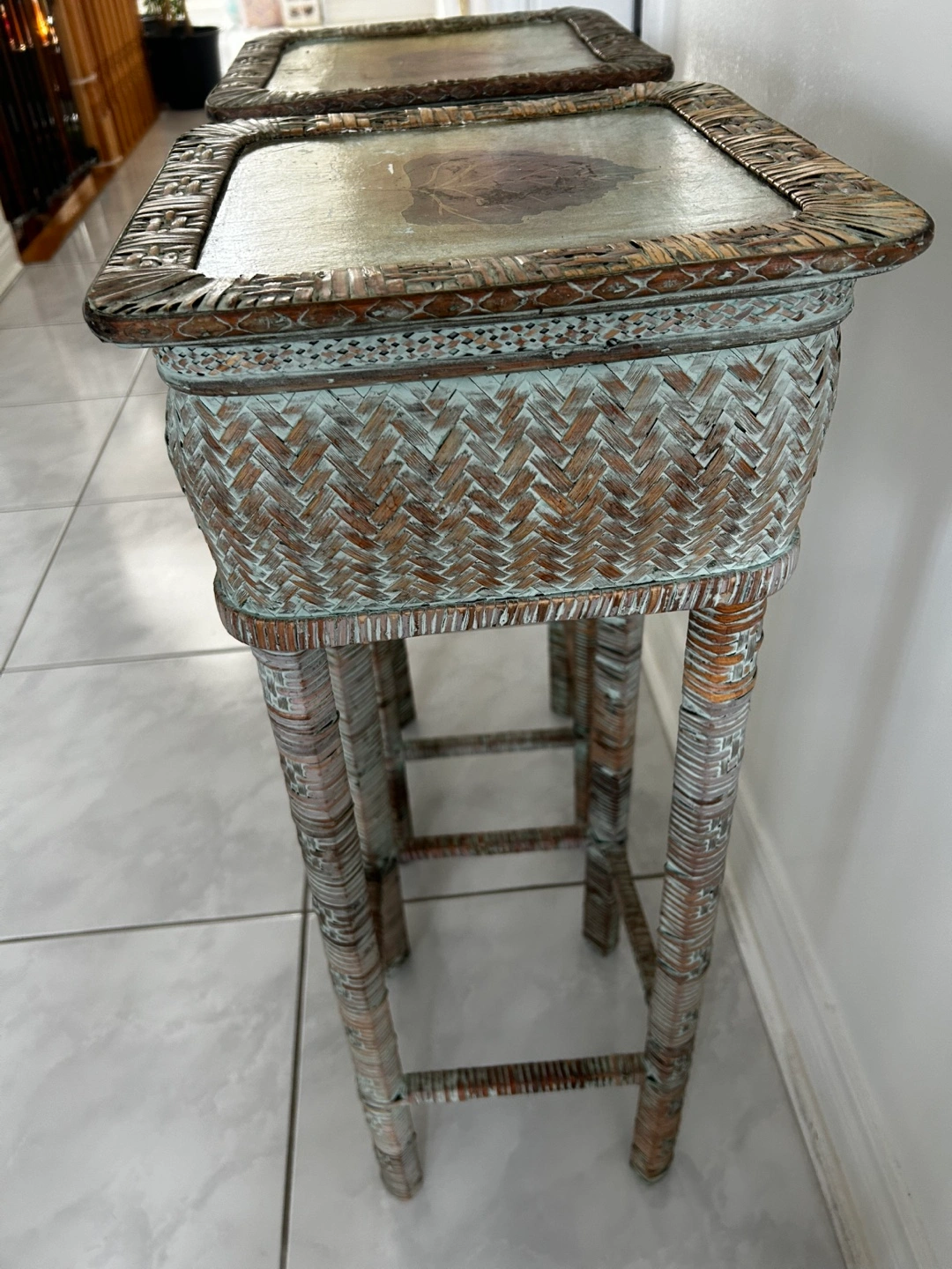 Unique pair of plant stands. Wicker construction. Distressed green-grey finish. Square tops feature pressed leaf design. Tall, slender legs. Perfect for plants or decorative accents.