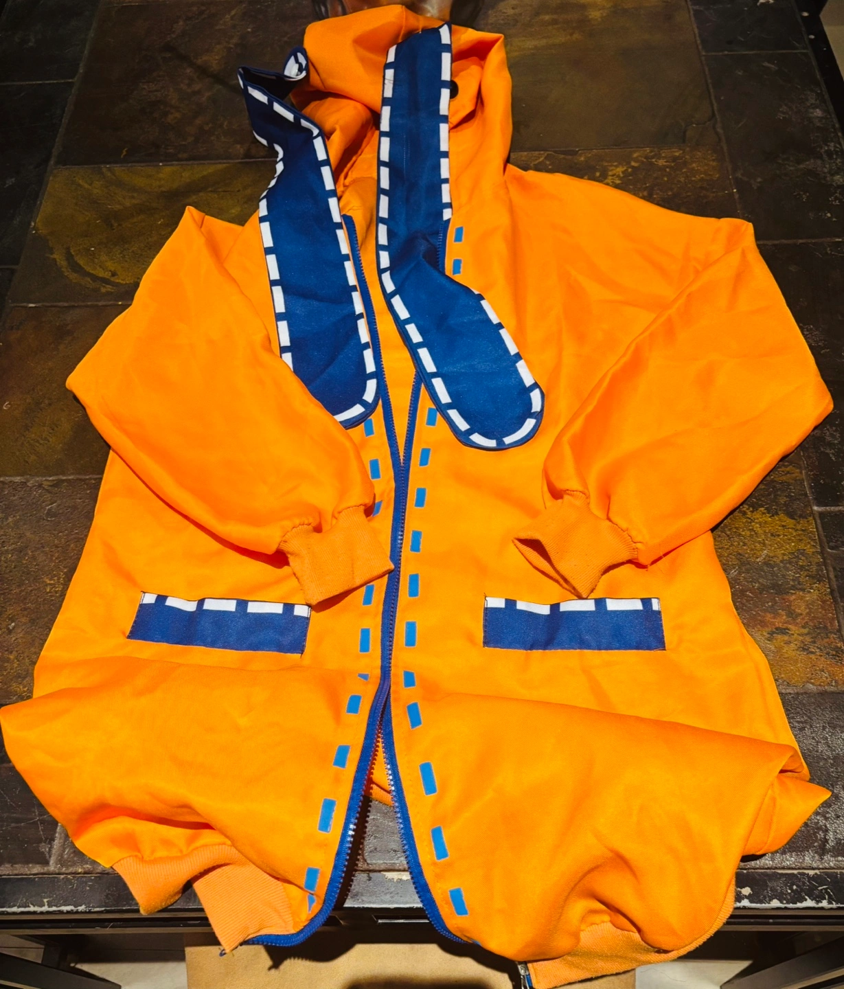Lightweight orange jacket. Features a hood, front zipper, and blue accents. Two pockets. Long sleeves with ribbed cuffs.