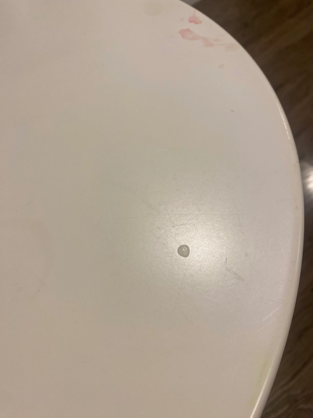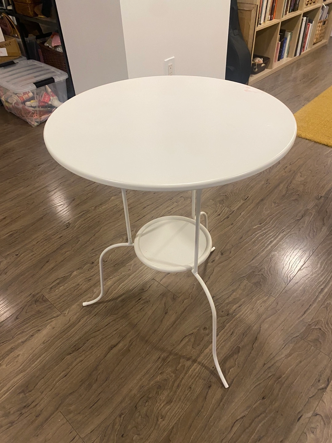 Small round ikea side table. White finish. Metal legs and lower shelf. Some surface marks on tabletop, used for arts and crafts. 😊