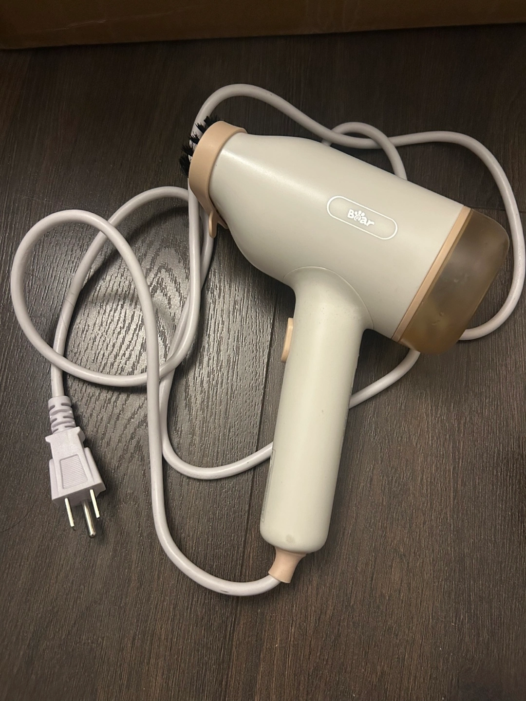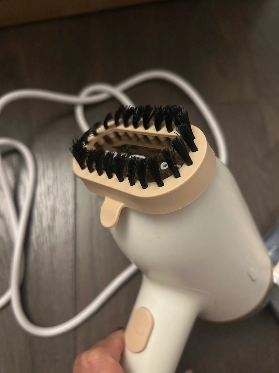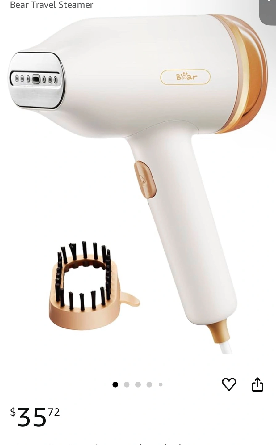 Portable handheld garment steamer. Great for travel. Features a brush attachment. White and beige colour.