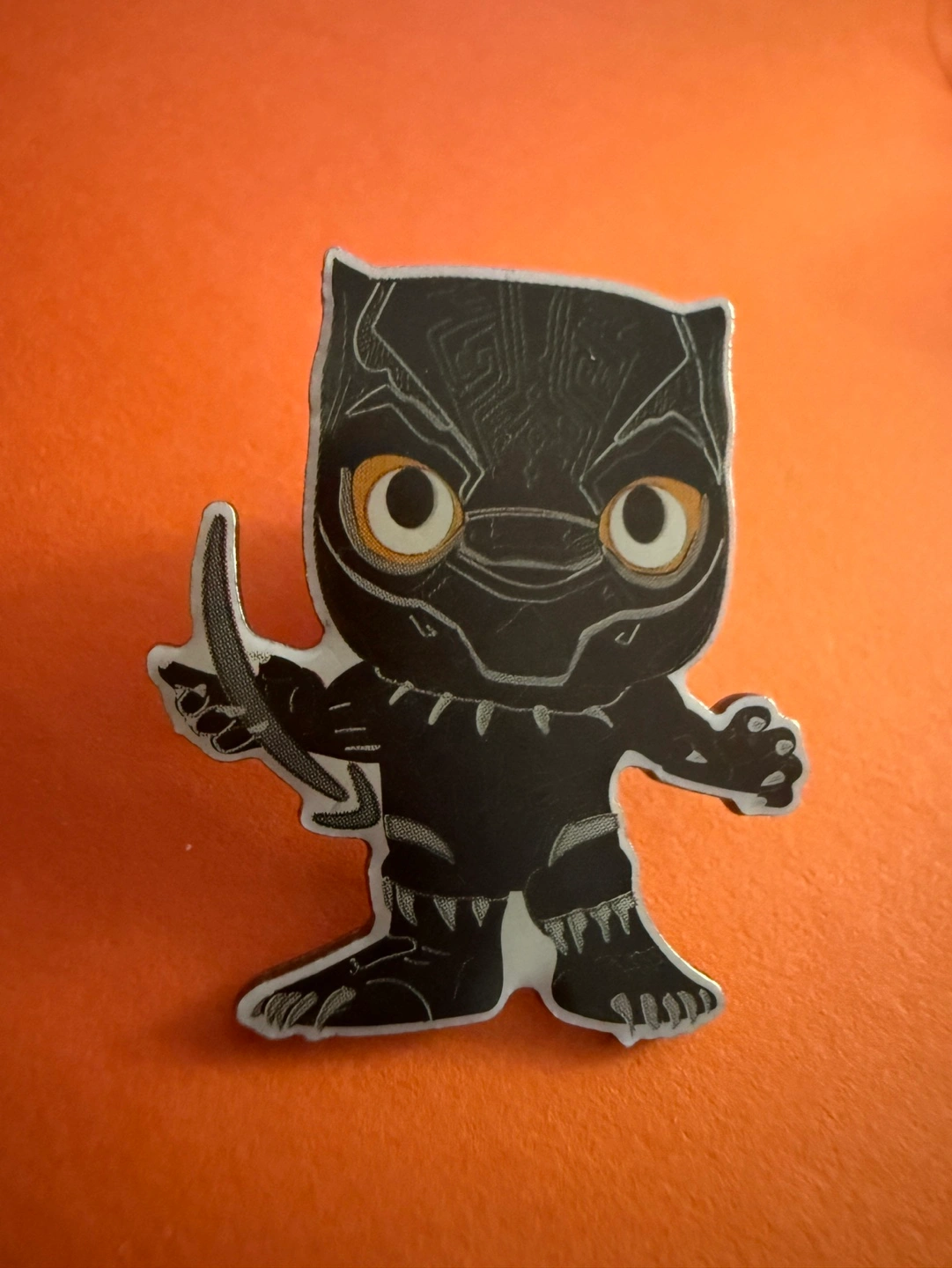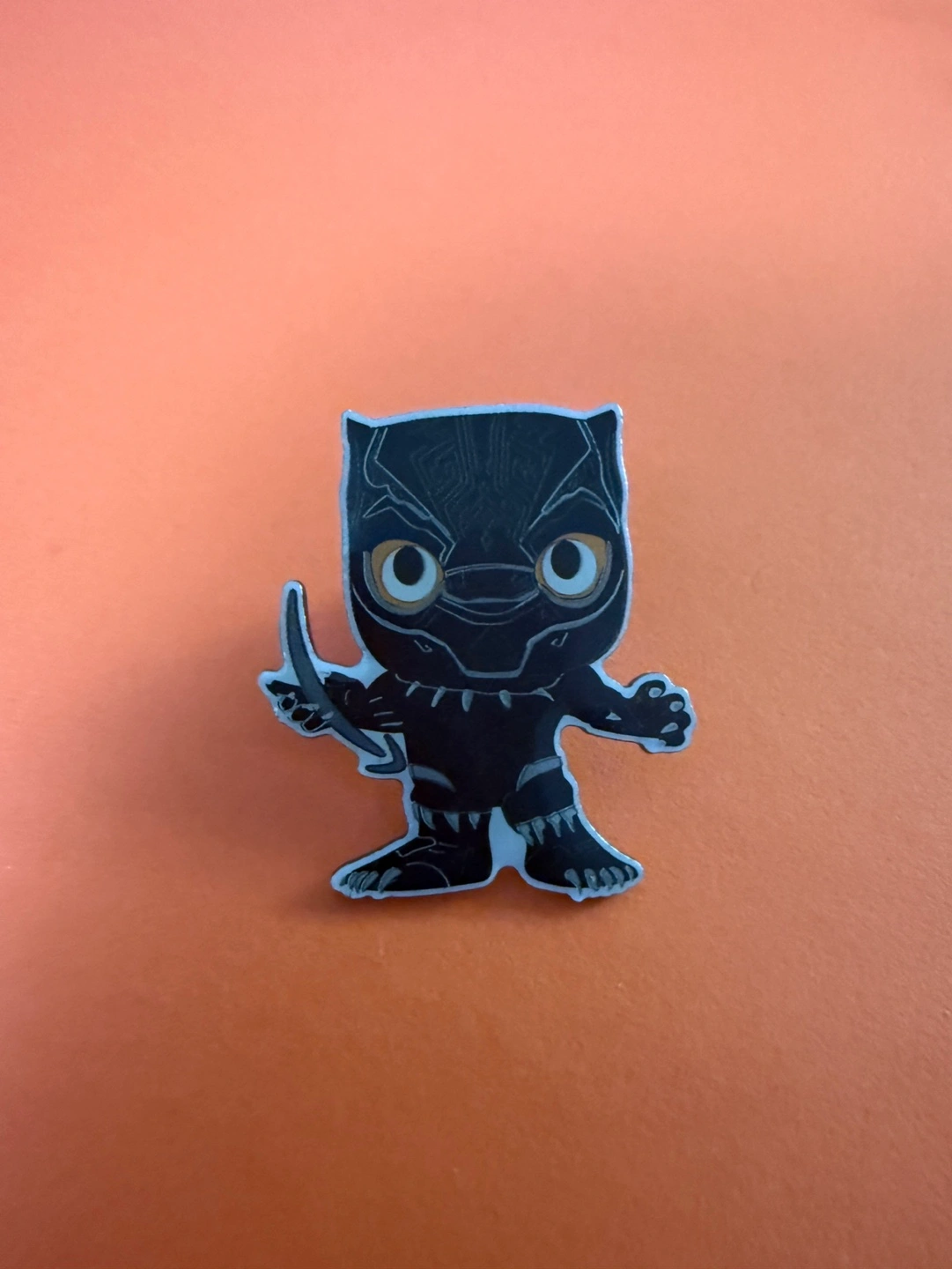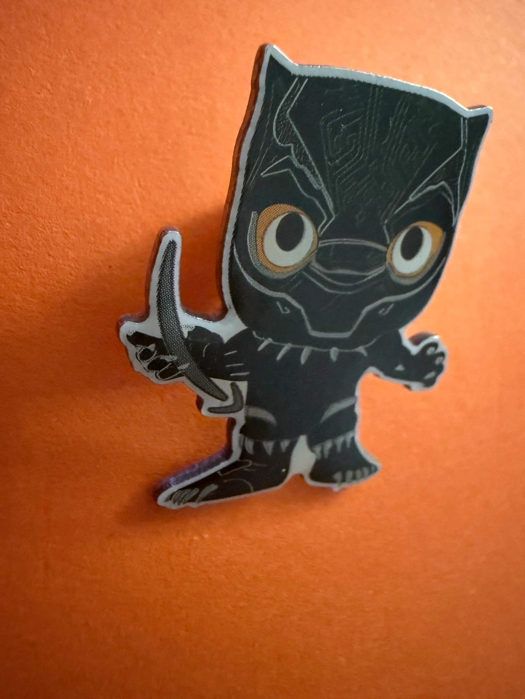 Cute Black Panther enamel pin. Collectible item. Great for bags, jackets, or hats. Metal pin with yellow clasp.