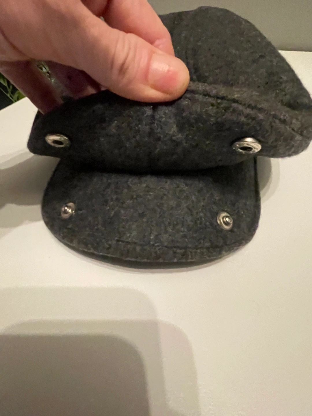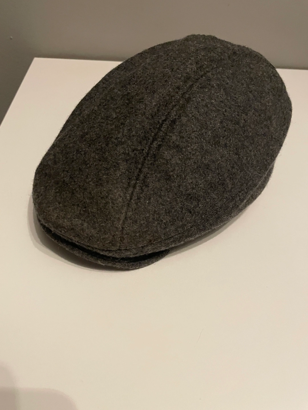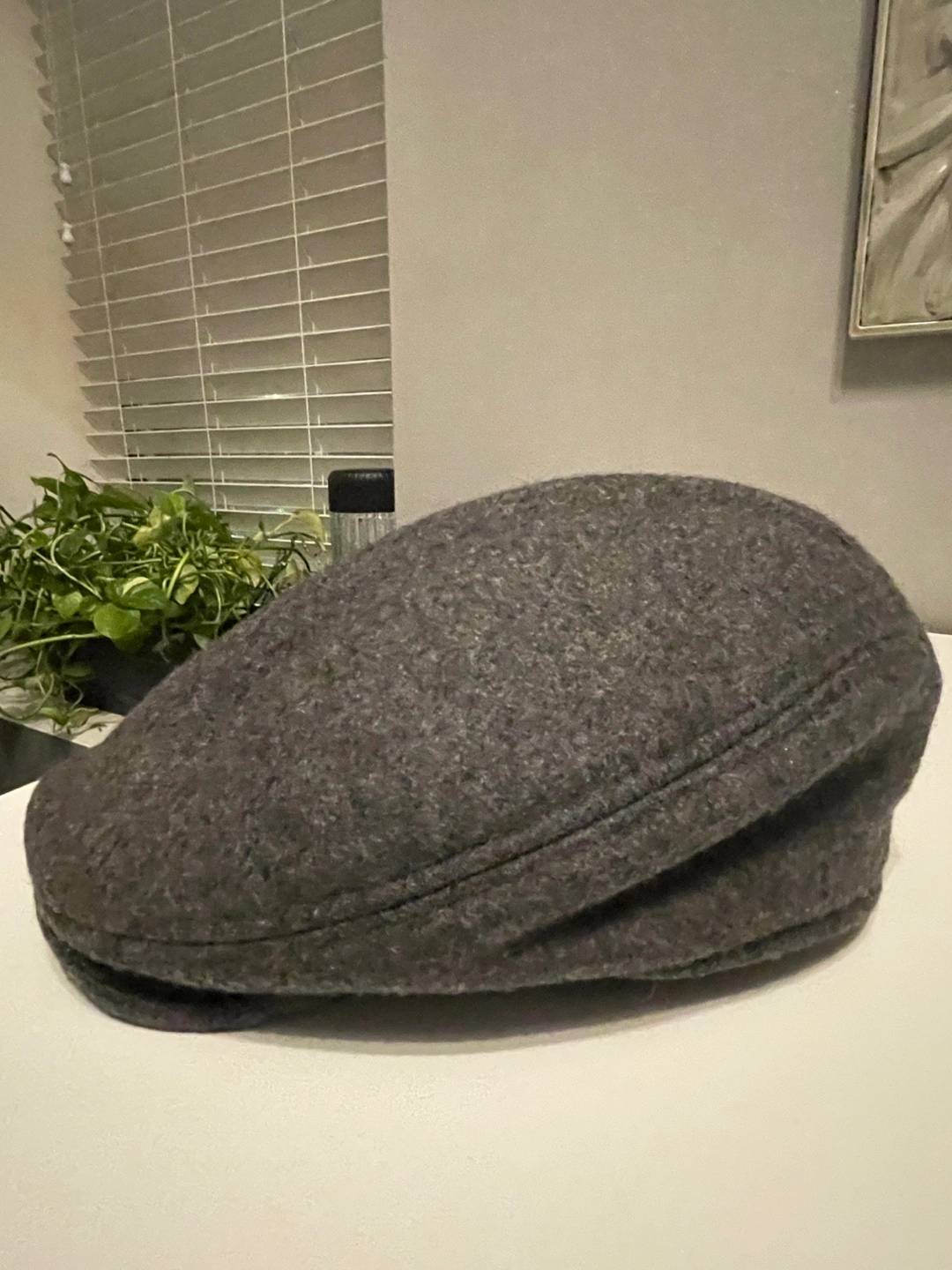 Gray wool newsboy cap. Features a soft wool exterior and a red interior lining. Small metal accents on the bill. Good condition.