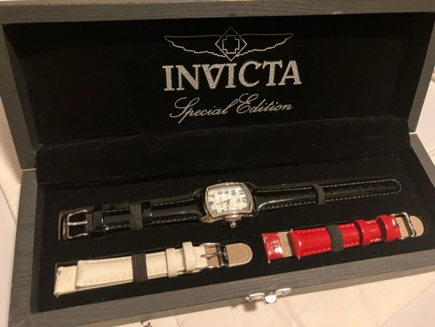 519Open to offers. Invicta Special Edition silver watch. Never Used but likely needs new batteries. Includes interchangeable black, red and white leather bands. Comes in original box.