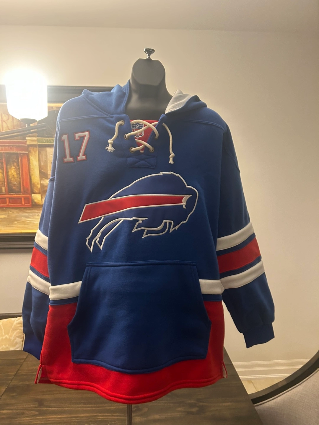 Men's Buffalo Bills Josh Allen #17 hoodie. Blue, red, and white colour scheme. Features a drawstring hoodie and team logo. New with tags. Beautiful and a tough find.