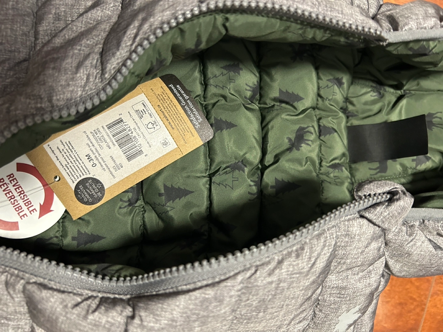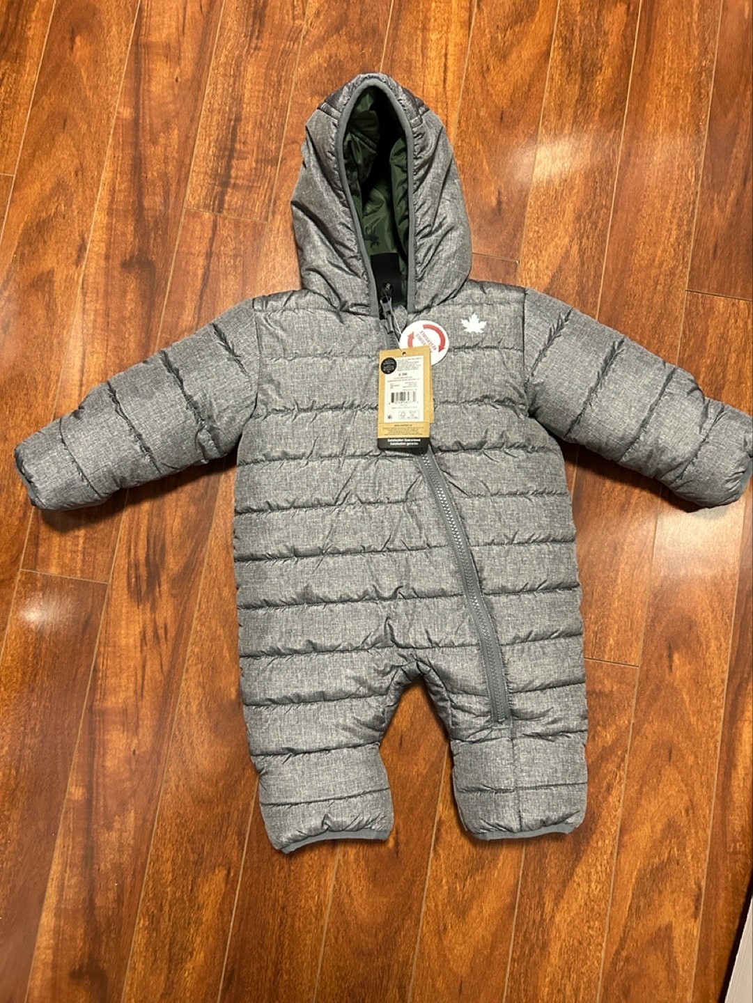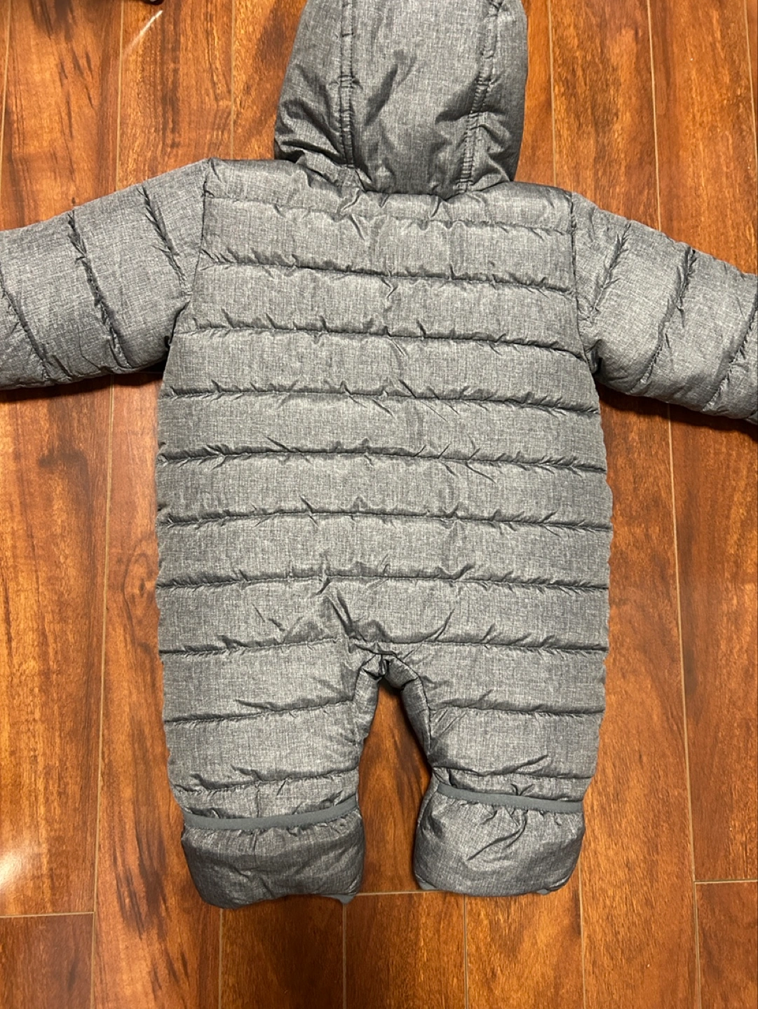 Adorable baby snowsuit, grey and green reversible. Size 0-3 months. Zipper closure. Hooded. Great for winter weather.