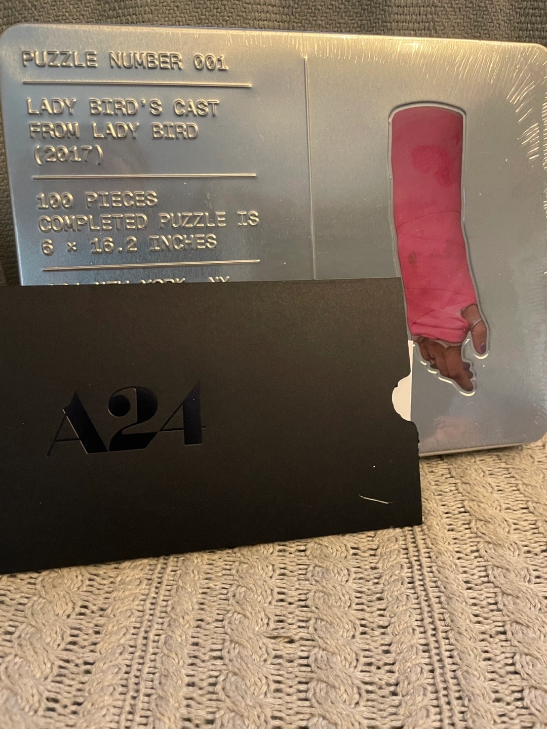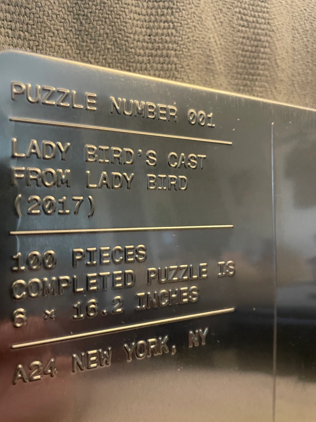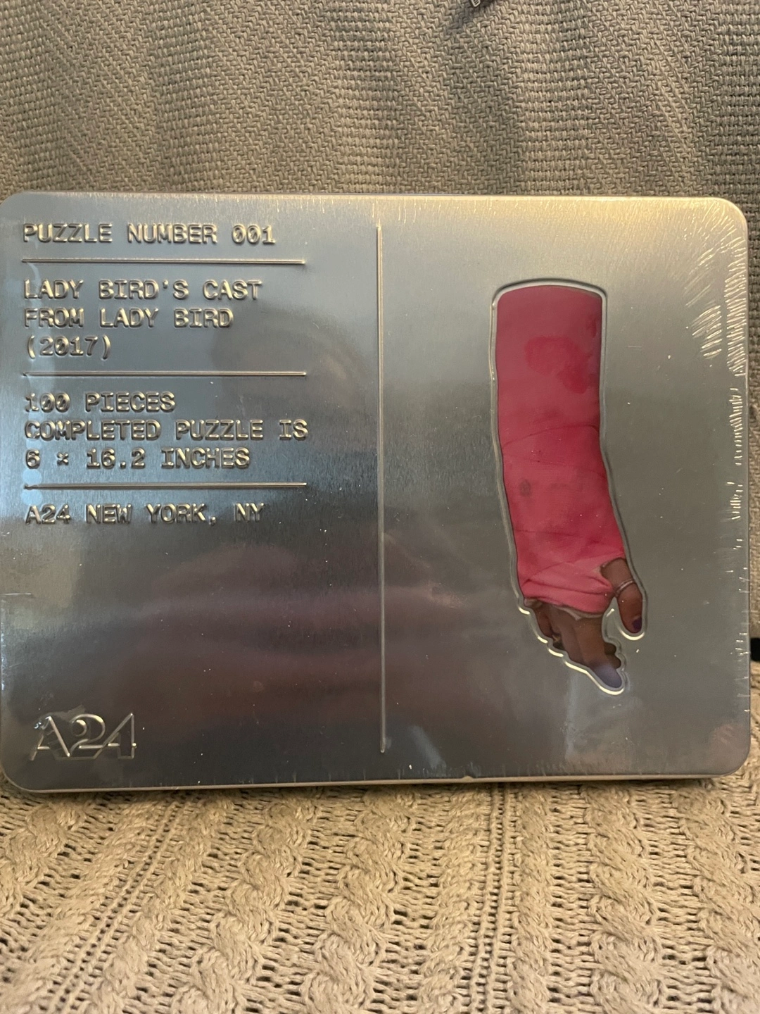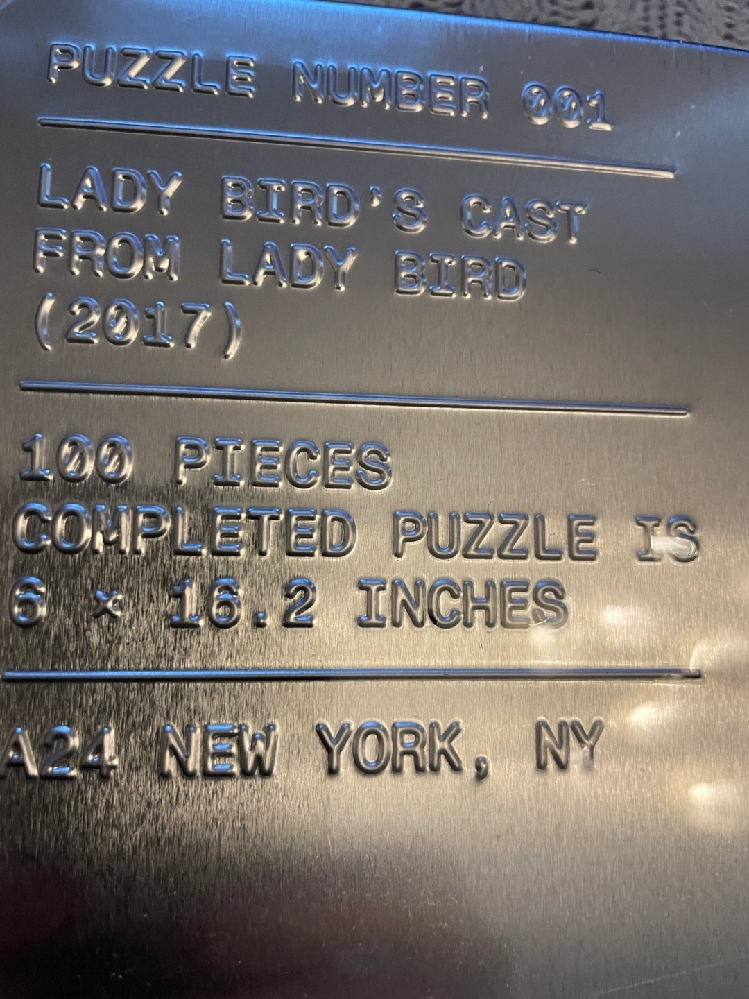 A24 Lady Bird movie puzzle. 100 pieces. Completed puzzle measures 6 x 16.2 inches. Comes in a metal tin with black sleeve. Still in wrapper.
