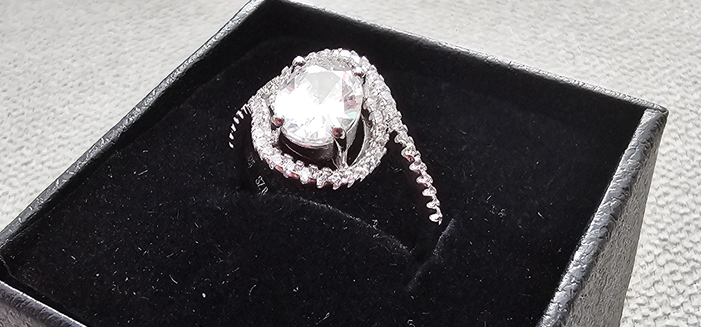 Stunning ring, features a large cubic zirconia centre stone. Silver band with smaller cubic zirconias. Size 7.8.