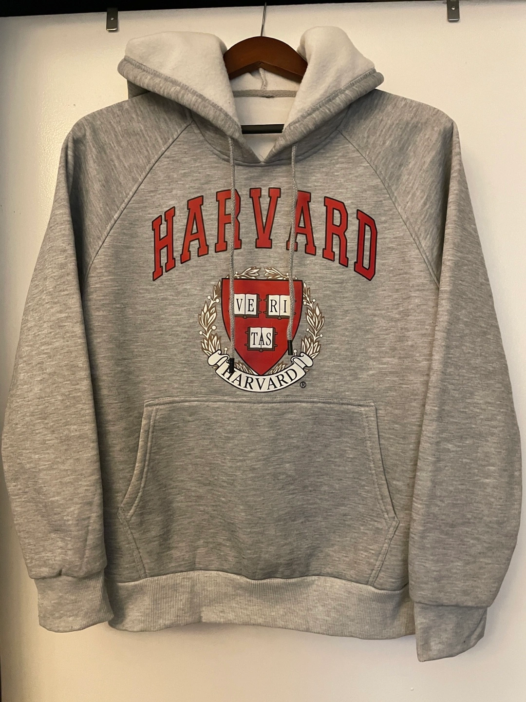 Gray Harvard University hoodie. Features a large Harvard logo on the front. Soft material. Great for casual wear.