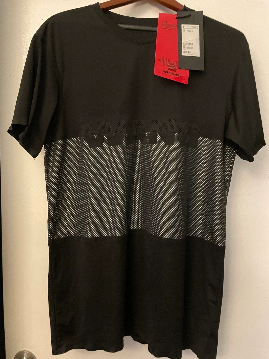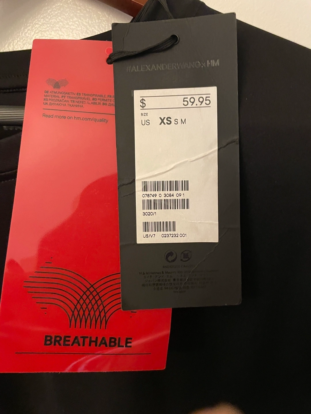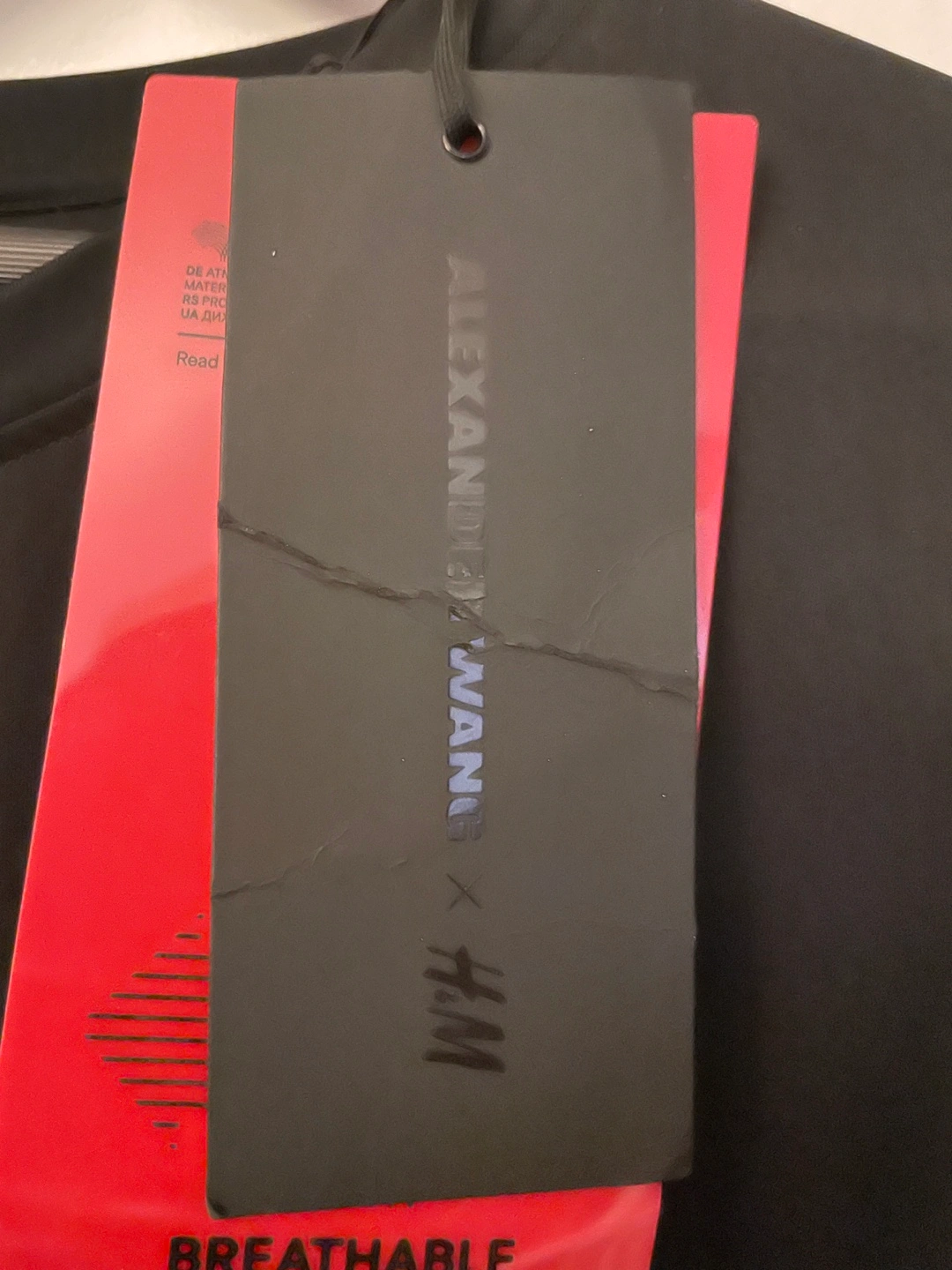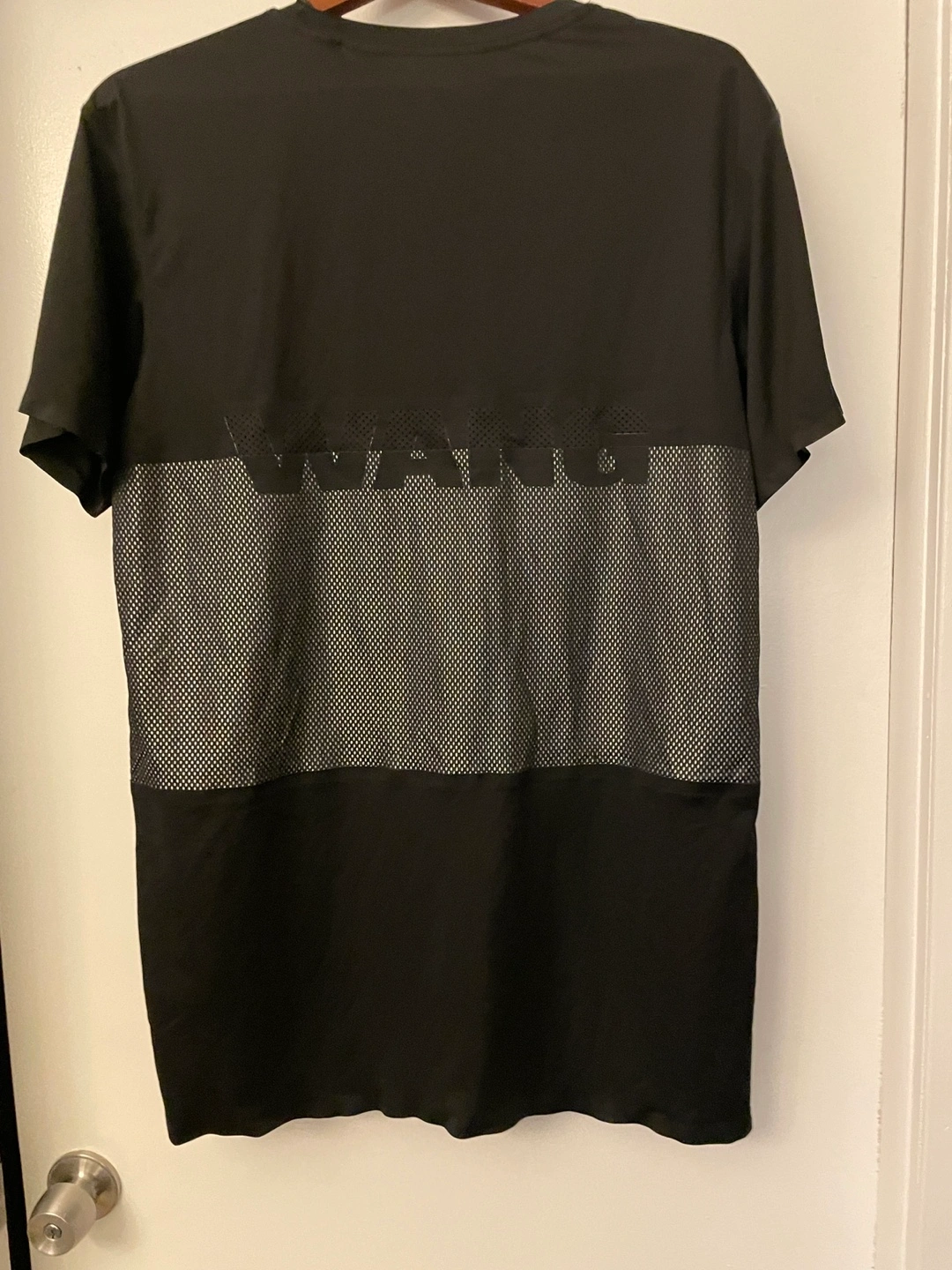 Black short sleeve t-shirt. Breathable fabric. Mesh panel detail. Alexander Wang x H&M collaboration. Size extra small but I think it looks bigger.