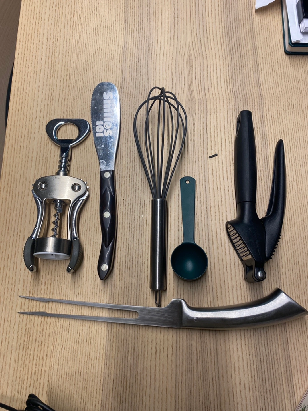 Set of six useful kitchen tools. Includes a stainless steel whisk, corkscrew, and spatula. Also features a garlic press, a carving fork, and a small spoon. Great for everyday cooking and baking.