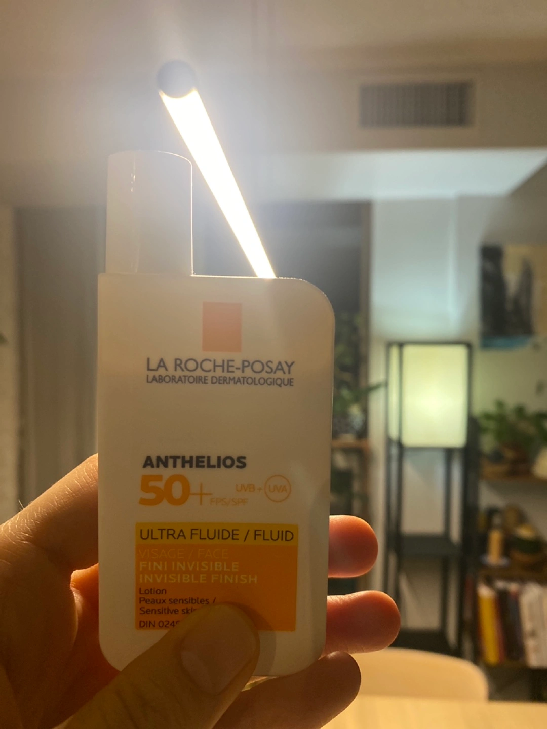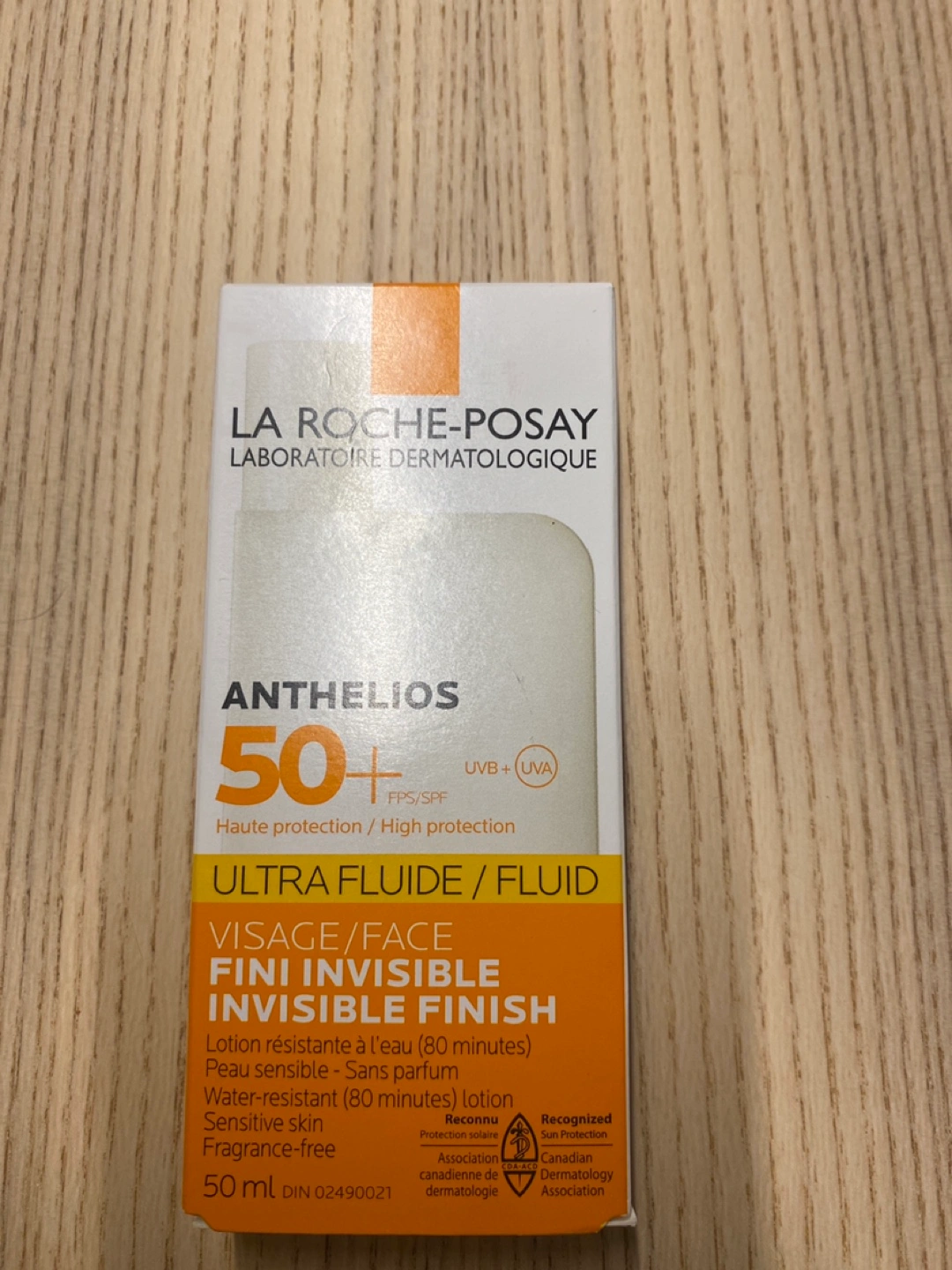 New La Roche-Posay Anthelios sunscreen. SPF 50+ Ultra fluid face lotion. Invisible finish. Water-resistant (80 minutes). Fragrance-free. For sensitive skin.