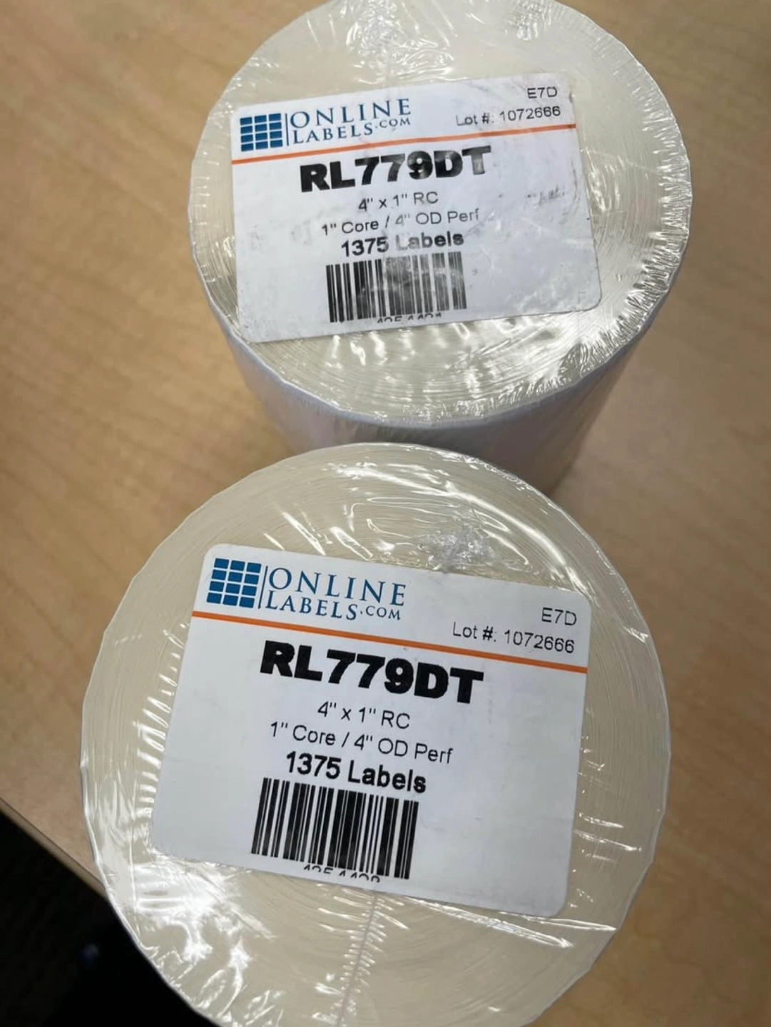 Two rolls of Online Labels RL779DT. Each roll contains 1375 labels. 4" x 1" size. 1" core/4" OD perf.
