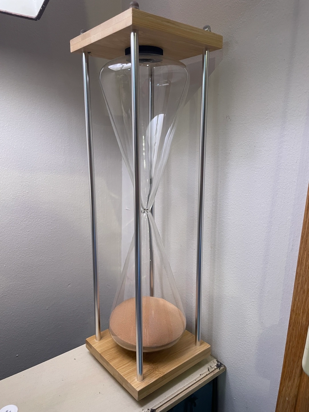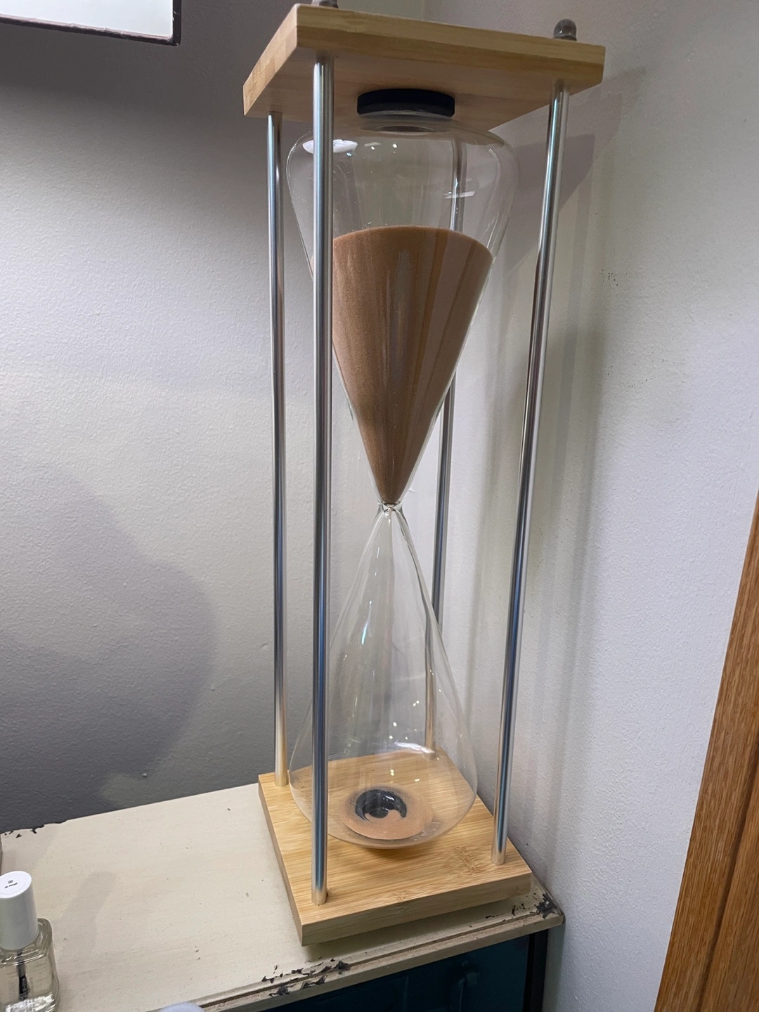 Tall glass hourglass with bamboo base and silver metal accents. Perfect for home decor or a unique timer. Sand is light brown.