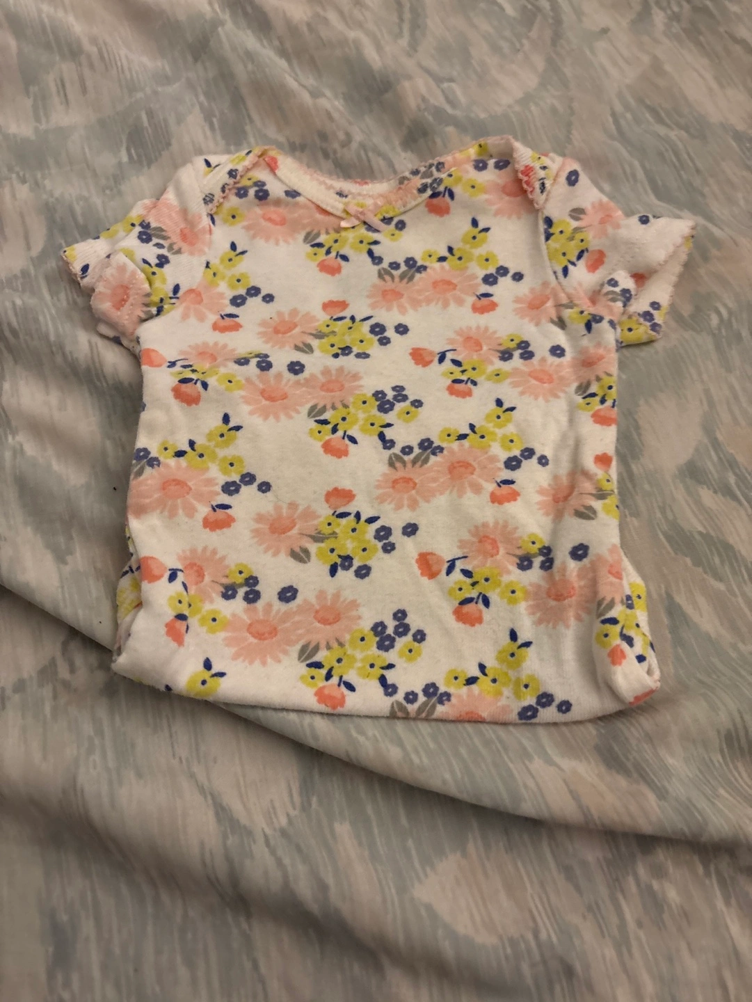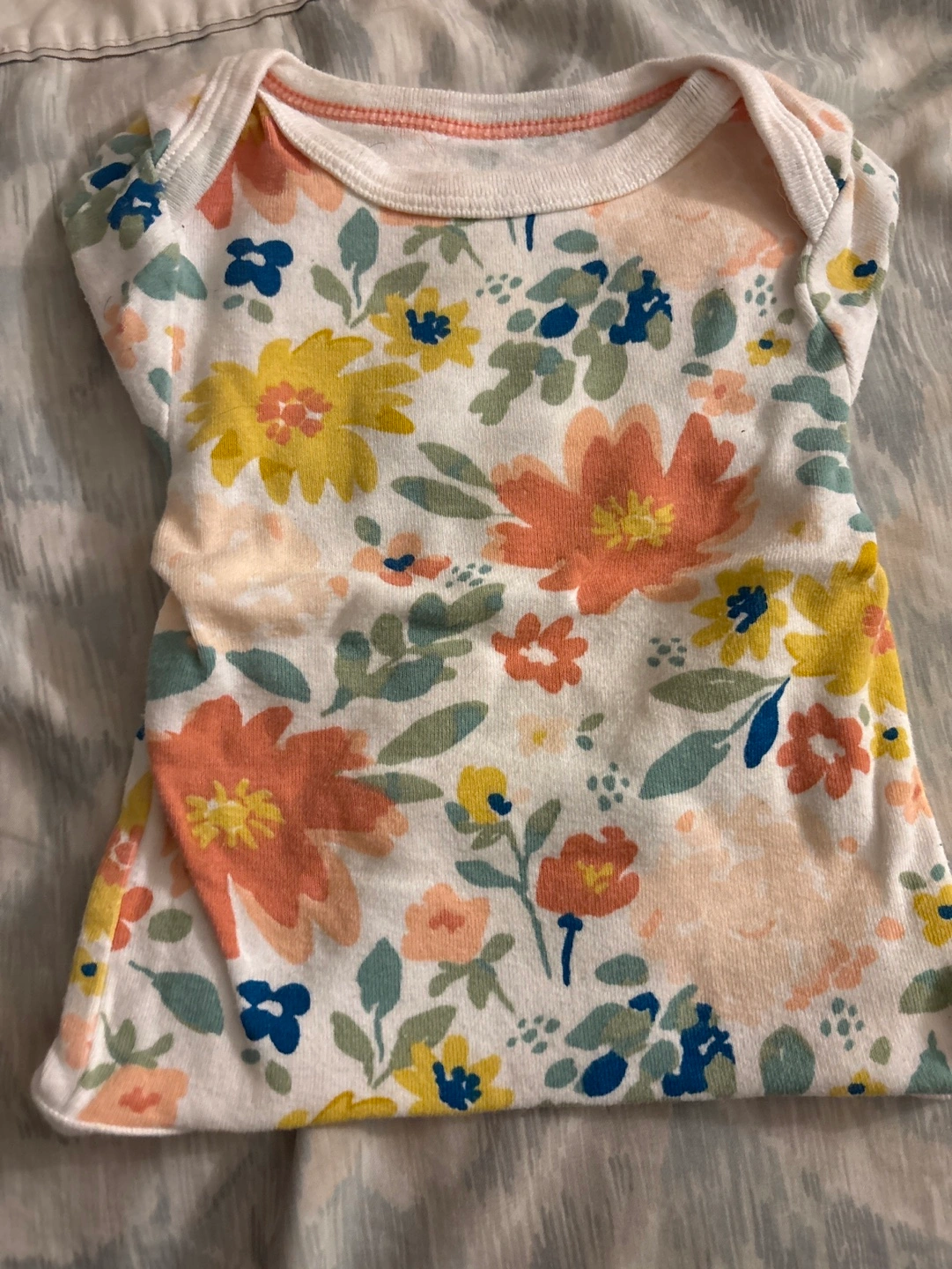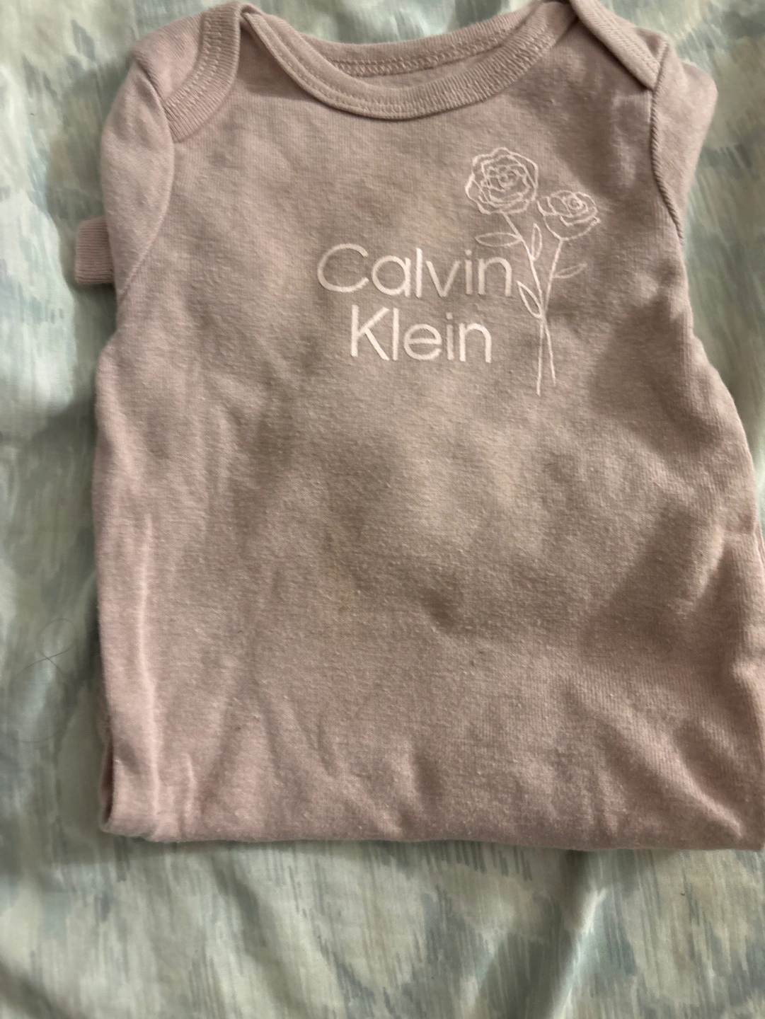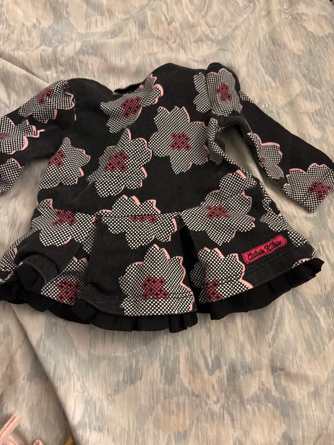 Adorable baby girl clothes bundle. Includes one white bodysuit with sparkly cute embroidery, one floral print bodysuit, one black floral print dress by Calvin Klein, one grey bodysuit with bird design, and one grey sleeveless top with a heart cutout. Perfect for a stylish little one.