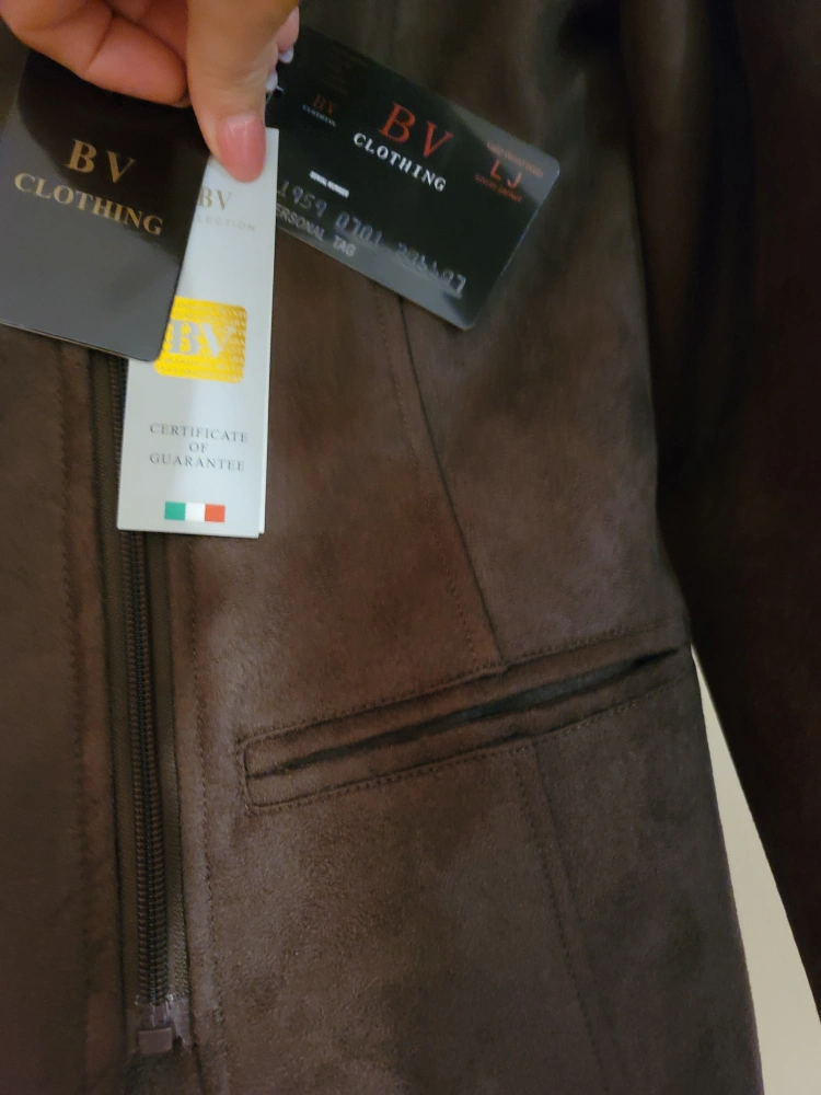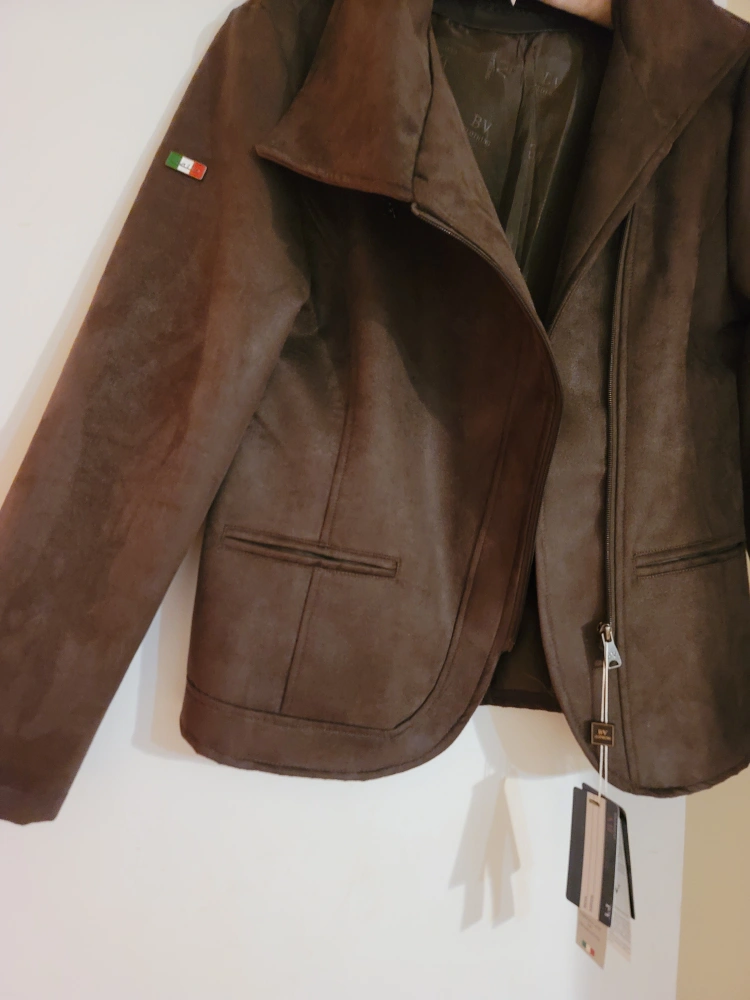 Women's brown suede jacket. Asymmetrical zipper closure. Features a collared neckline and pockets. Made in Italy. New with tags.