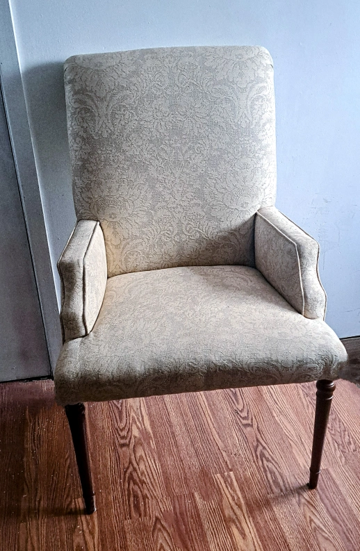 Beige upholstered armchair. Dark brown wooden legs. Floral patterned fabric. Comfortable and stylish. Perfect for living room or dining room.