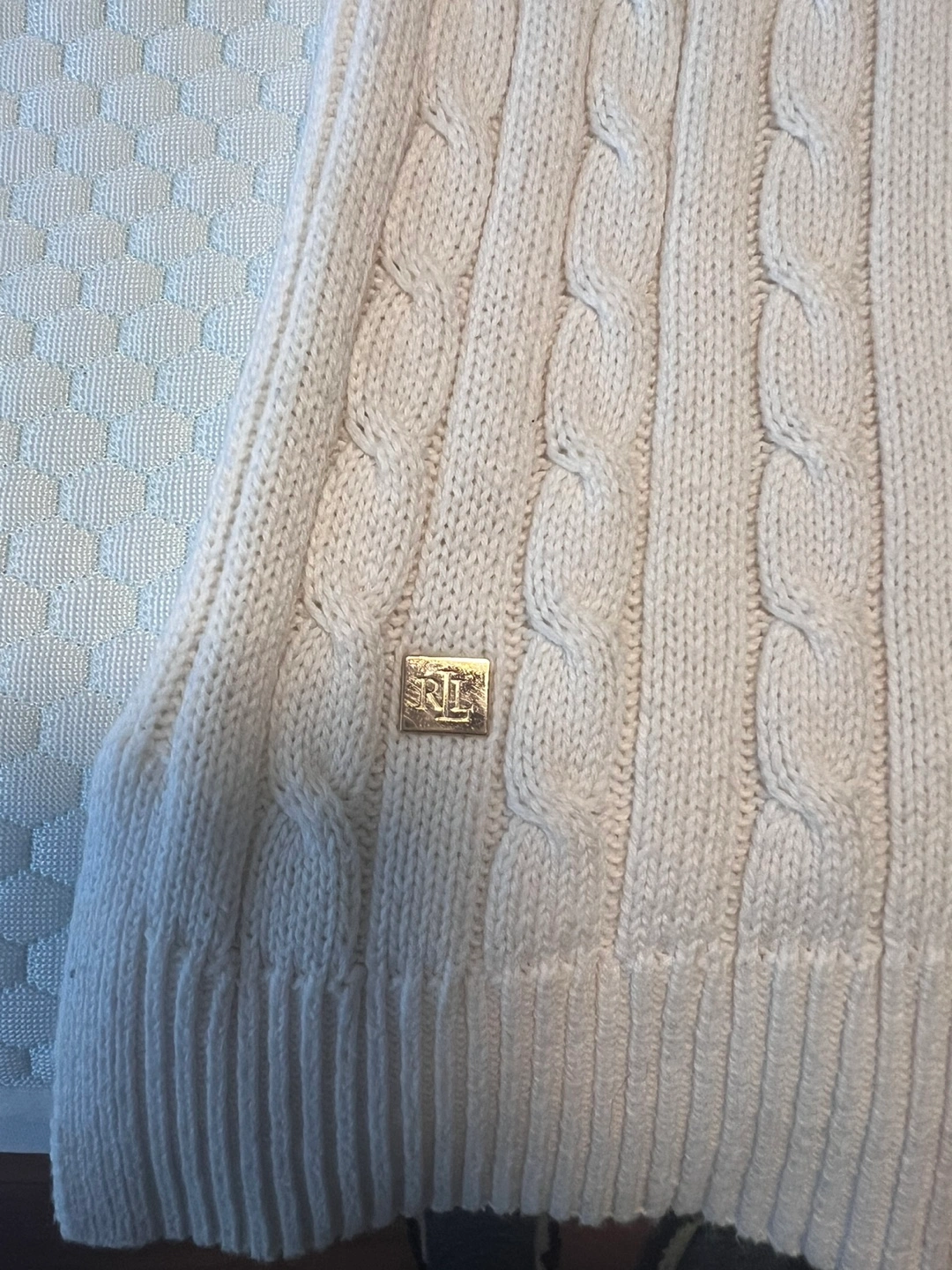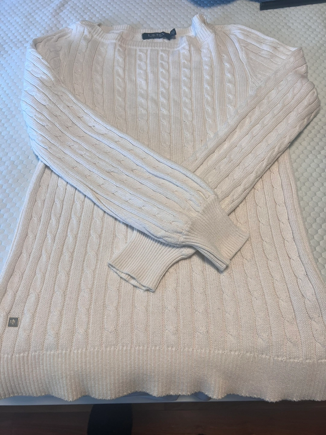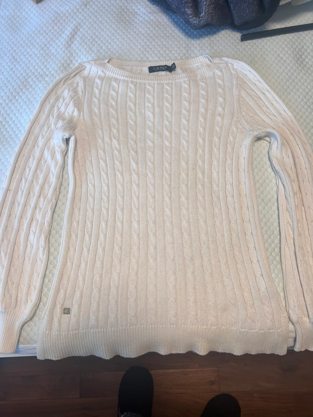 Women's size medium cream-coloured cable knit sweater. Long sleeves. Boat neck. Lauren Ralph Lauren brand. 100% cotton.