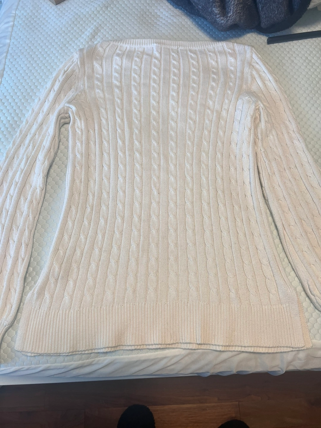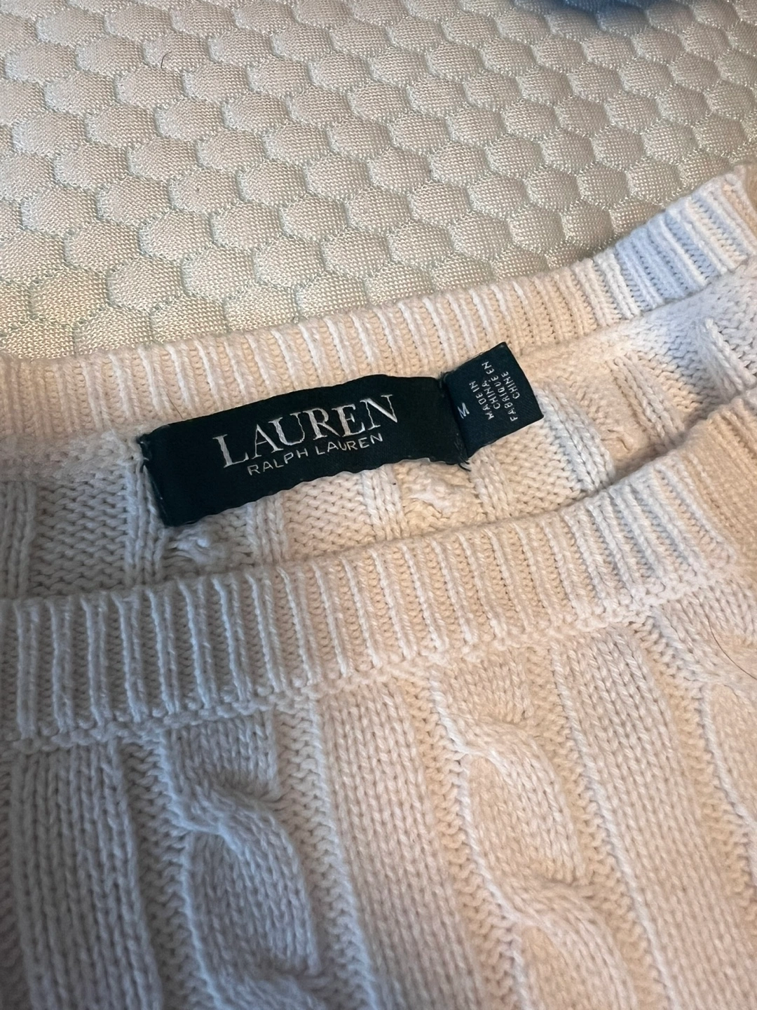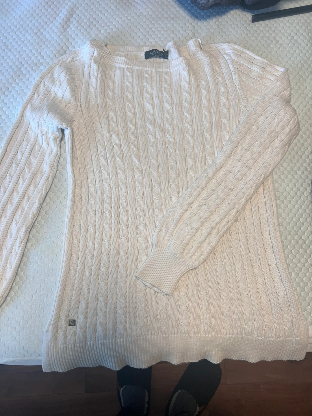 Women's size medium cream-coloured cable knit sweater. Long sleeves. Boat neck. Lauren Ralph Lauren brand. 100% cotton.