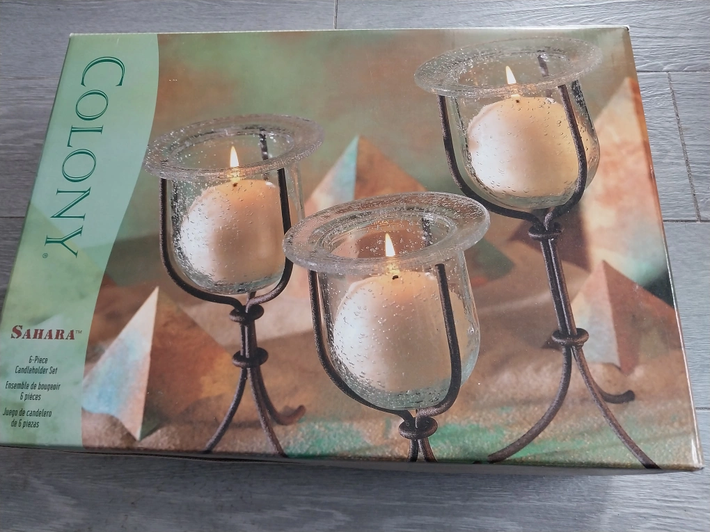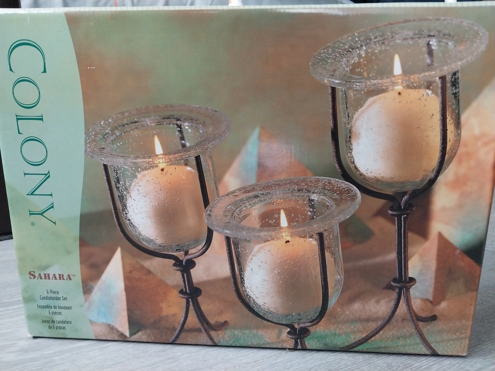 New in box. Sahara Glass and Metal six-piece candleholder set. Glass candle holders with metal stands. Elegant design.