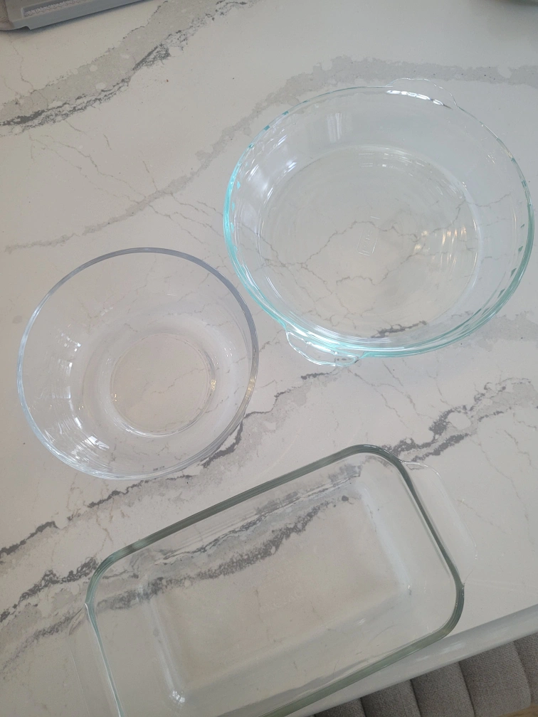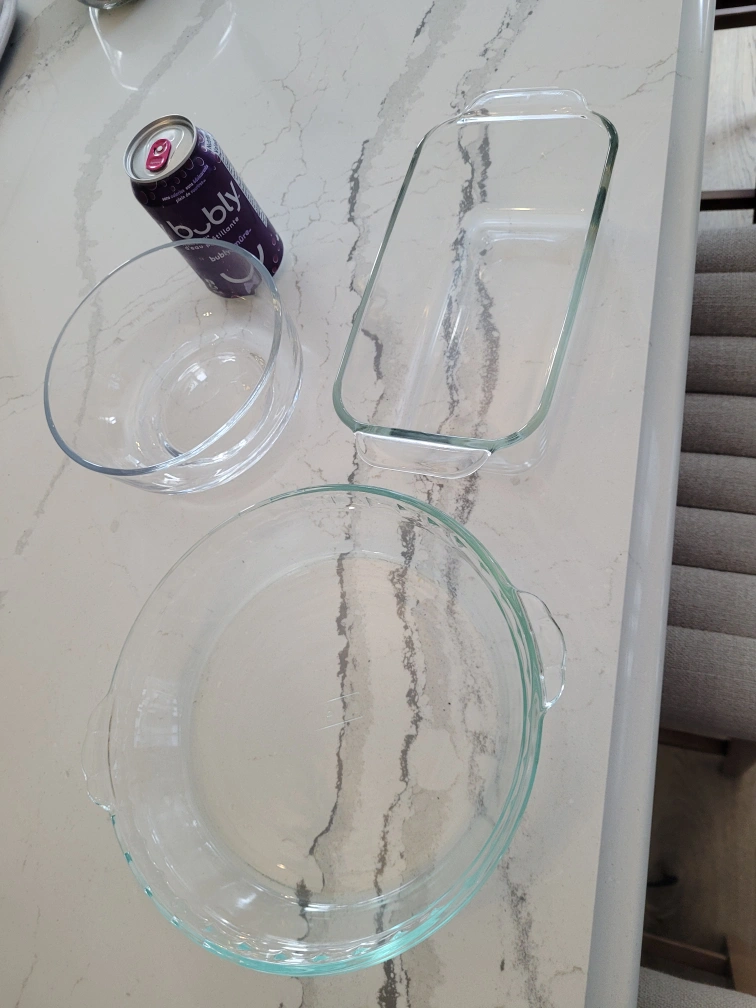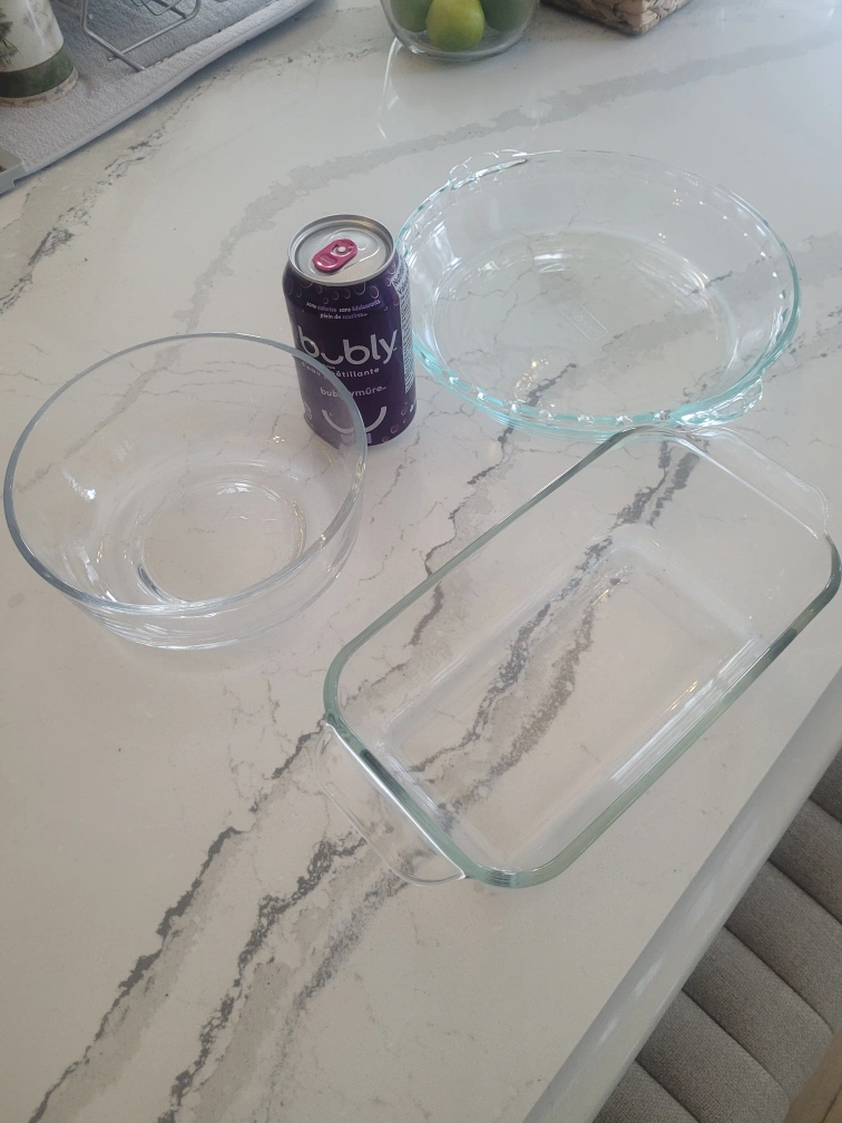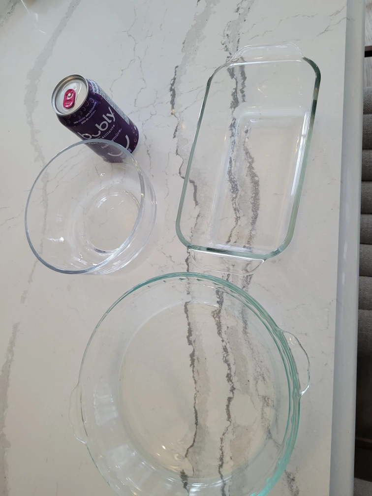 3 different style glass baking dishes. Includes one loaf pan 1 pie plate and medium shallow round