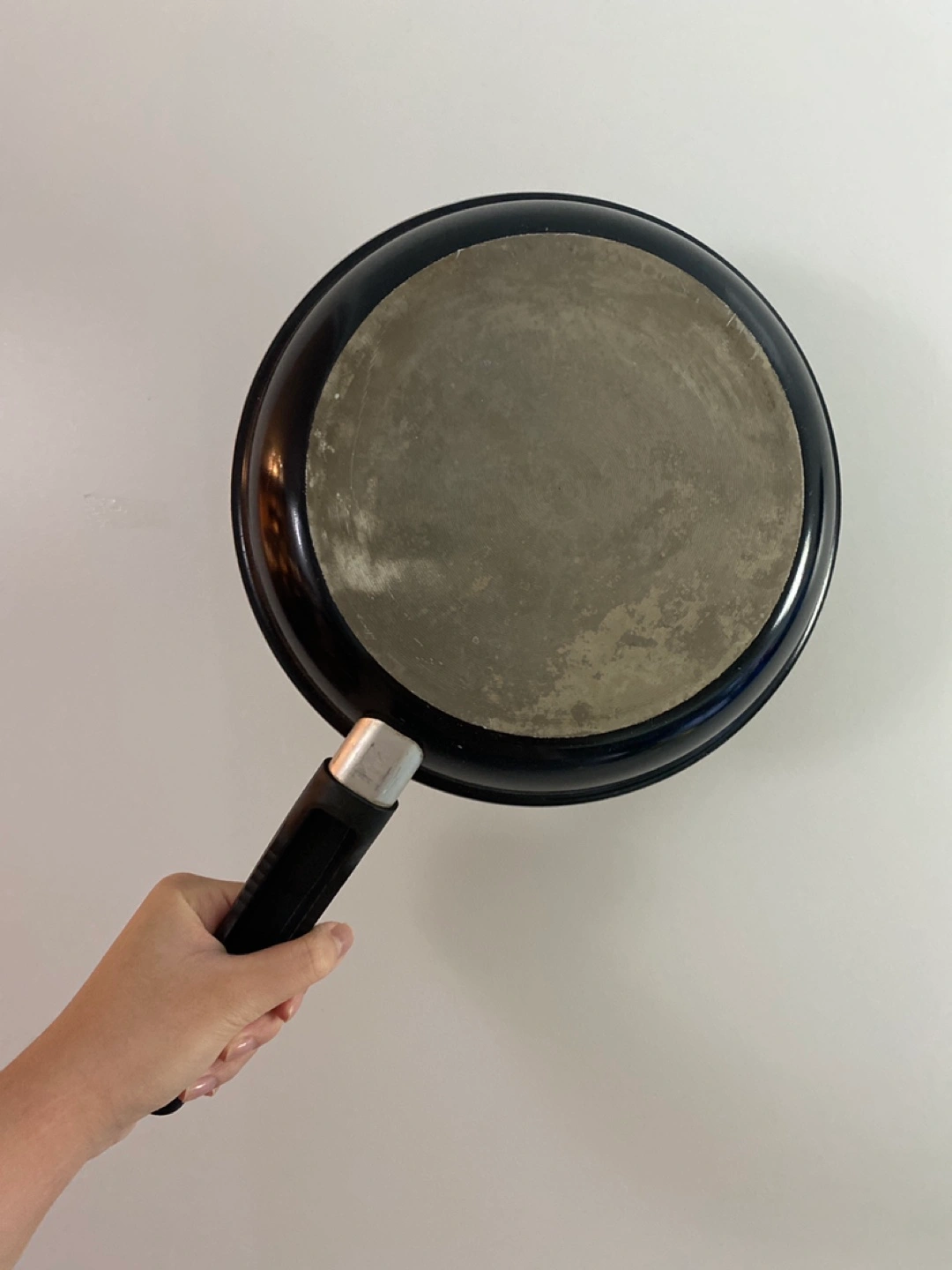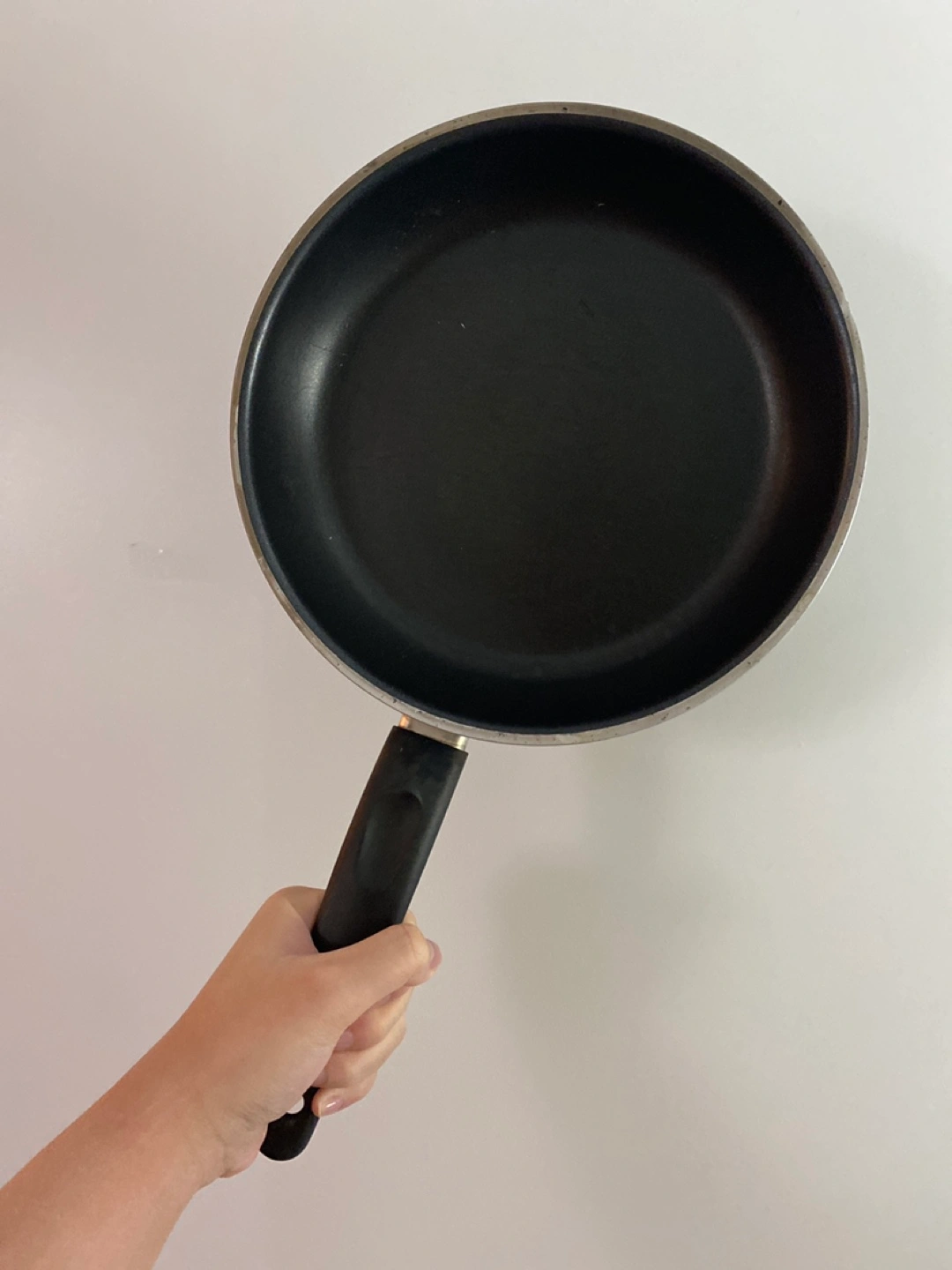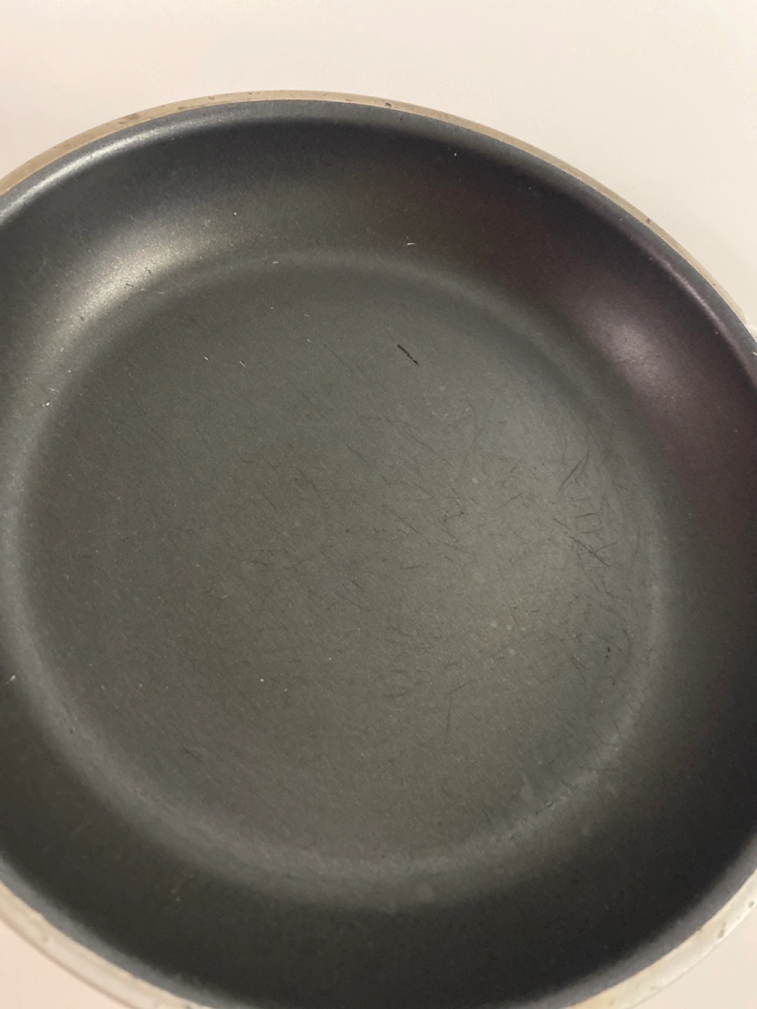 Black non-stick frying pan. Silver coloured rim. Ergonomic black handle. Shows some signs of wear.