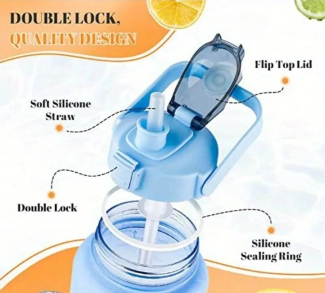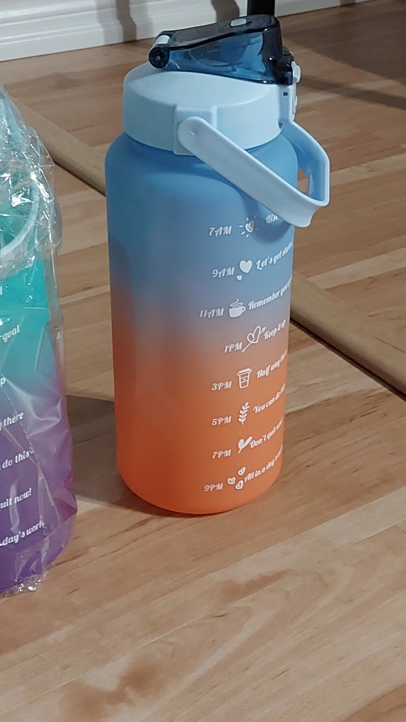 Three large capacity water bottles. Ombre colour design. Features a carrying handle and straw. Motivational quotes throughout the day. Double lock mechanism. Great for hydration!