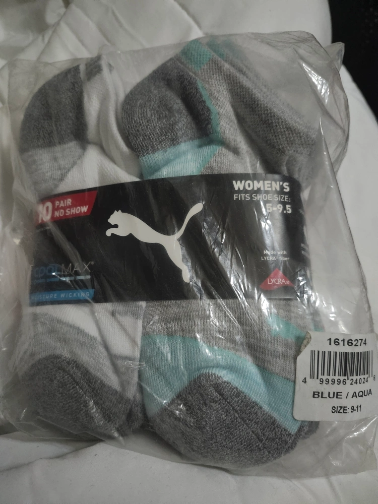 New Puma women's no show socks. Size 5-9.5. CoolMax moisture wicking. Blue and aqua.