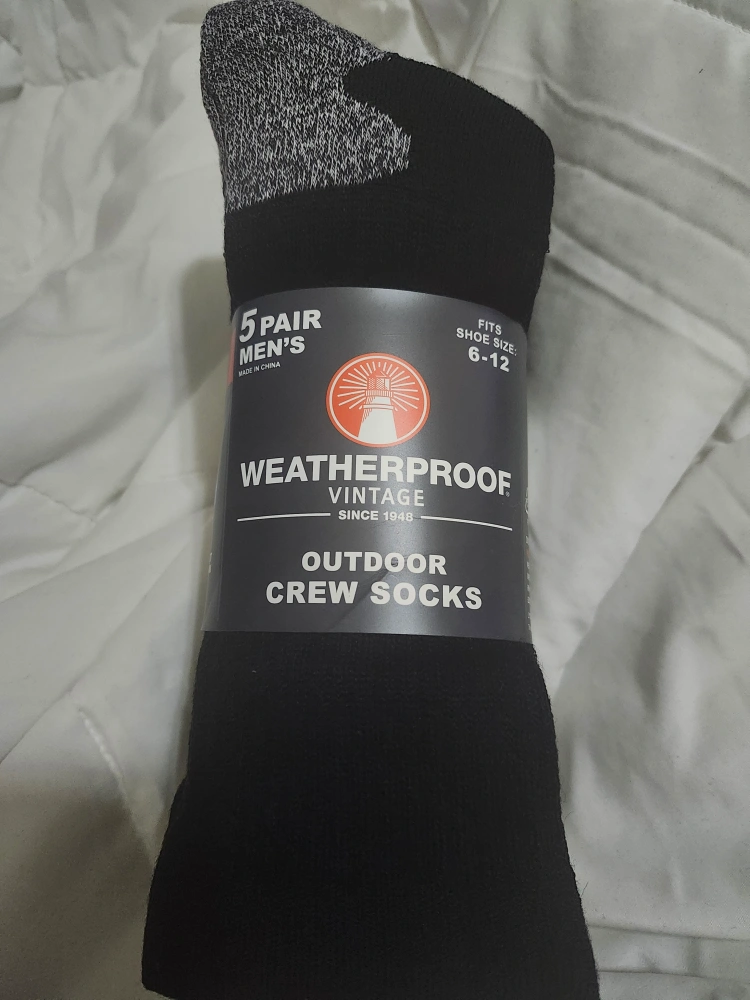 Five pairs of black men's crew socks. Size 6-12. Outdoor socks.