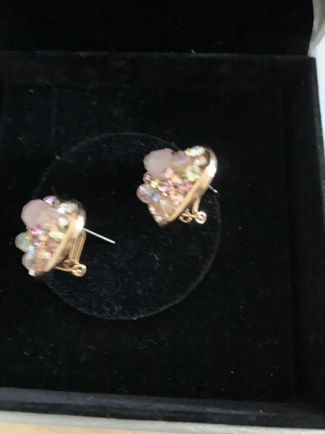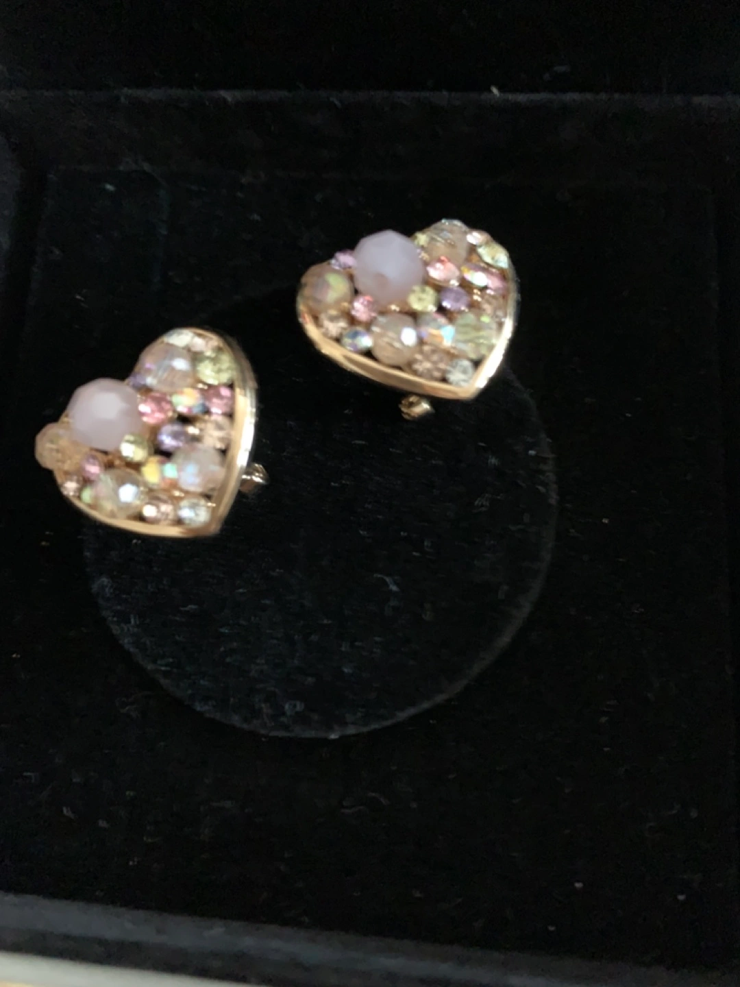 Beautiful pair of heart-shaped earrings. Gold-tone metal. Adorned with pastel-coloured stones and crystals. Clip-on closure. Presented in a jewellery box.