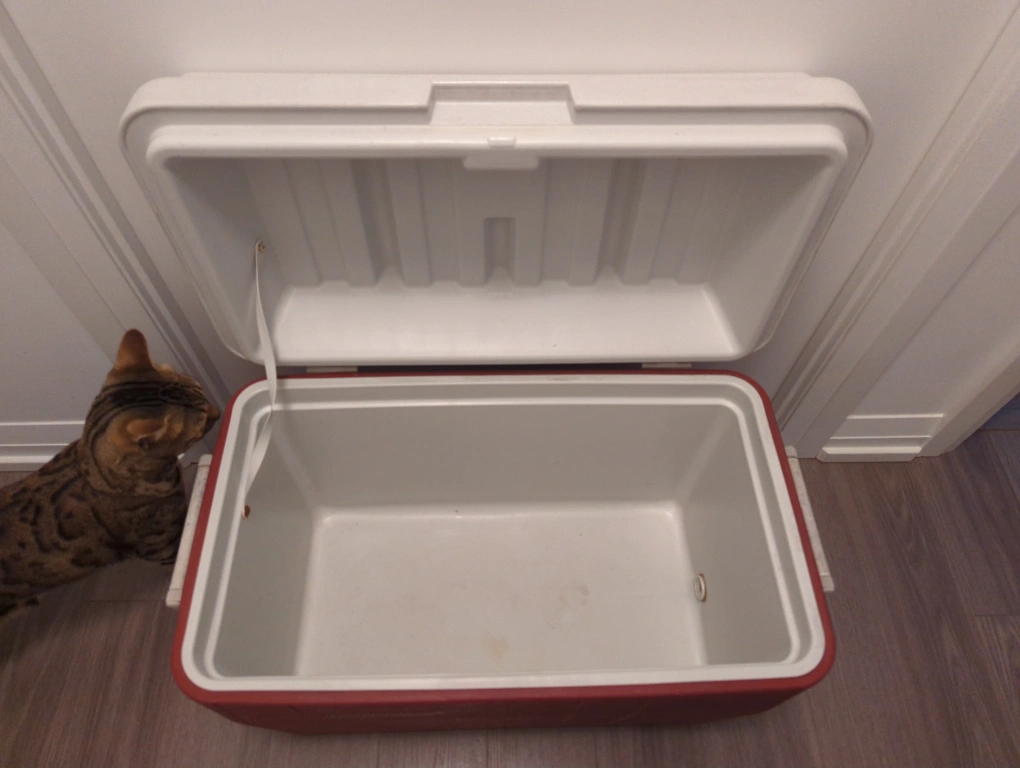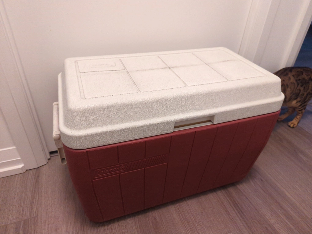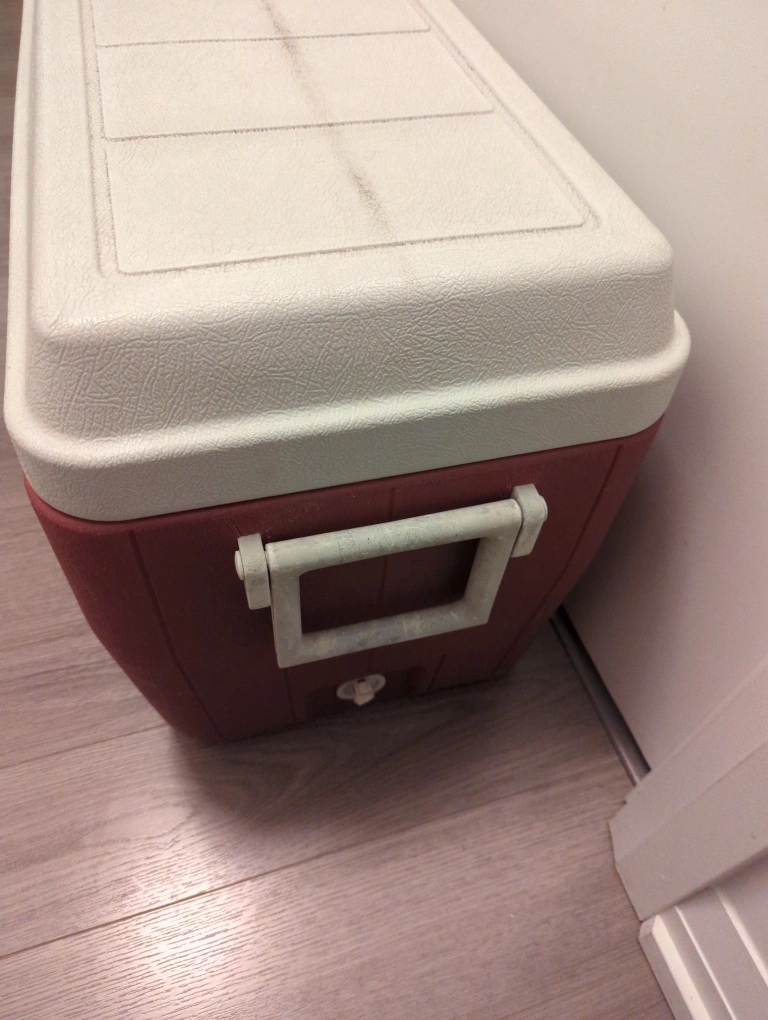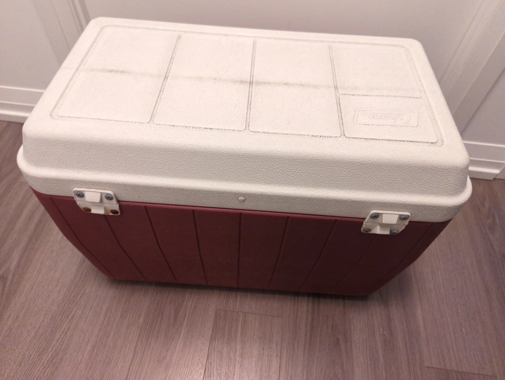 Large red and white plastic cooler. Good for keeping things cool. Interior is intact, exterior has slight crack. Drainage plug broken - cannot be removed.