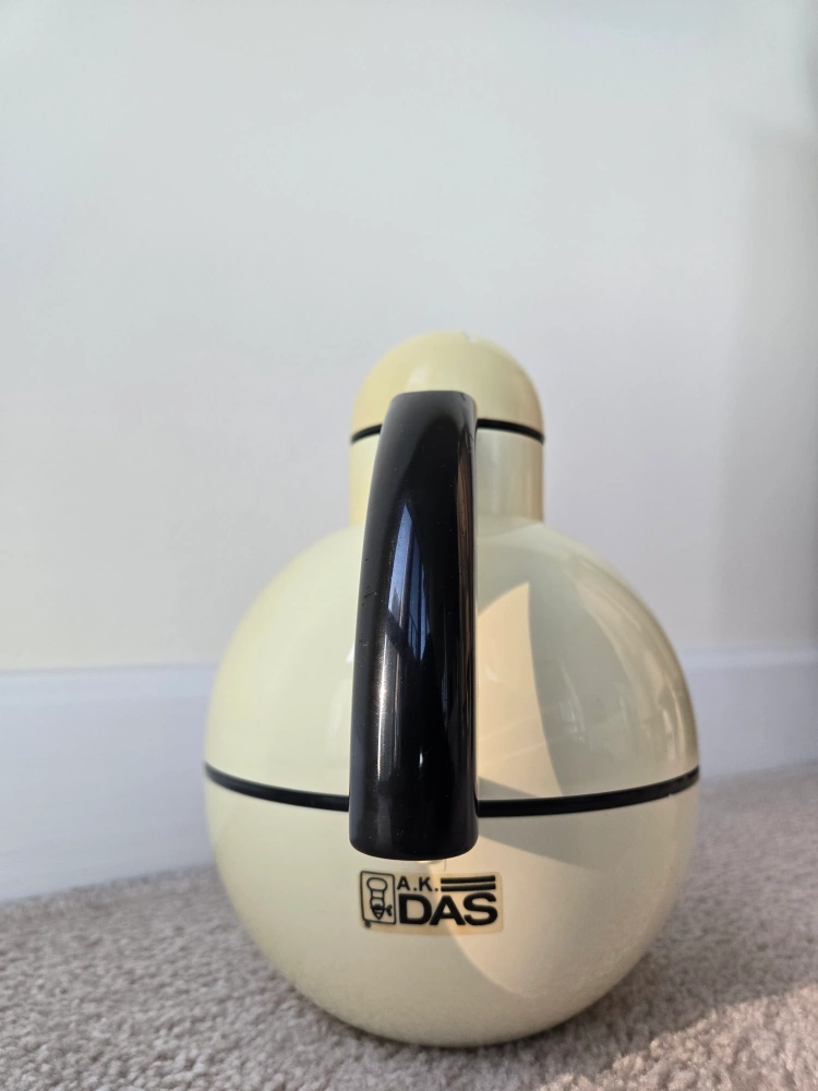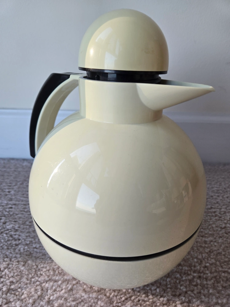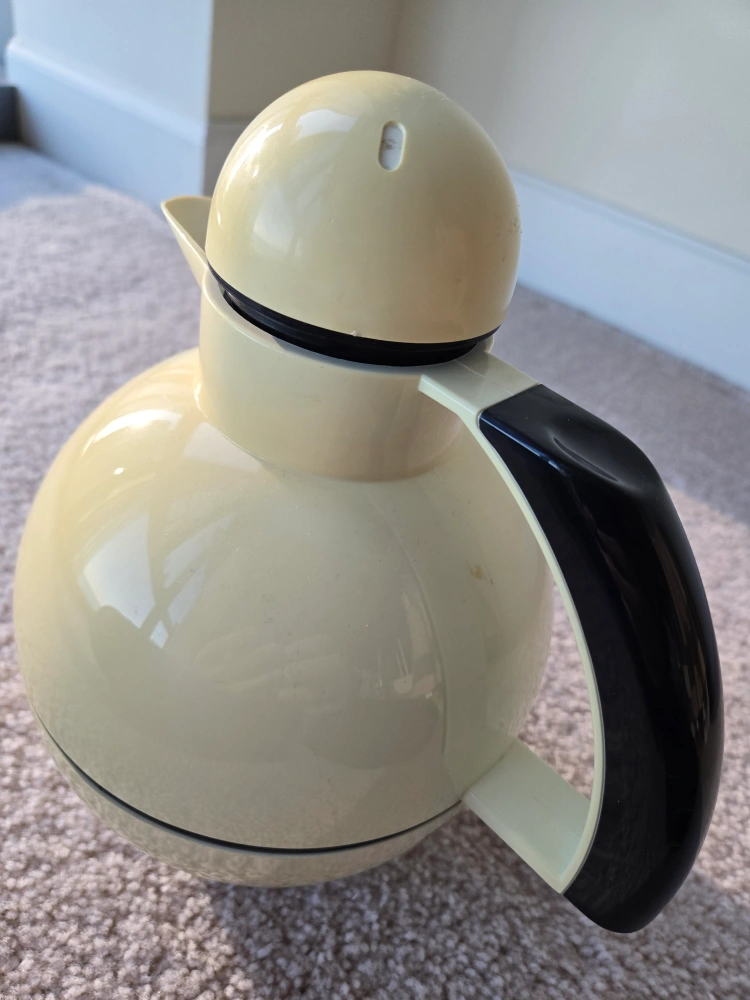Cream-colored vacuum carafe. Black handle and lid. Keeps liquids hot or cold. Made in Taiwan.