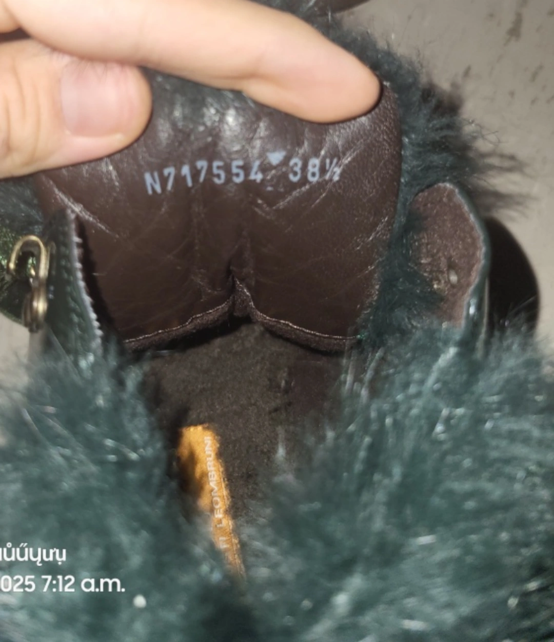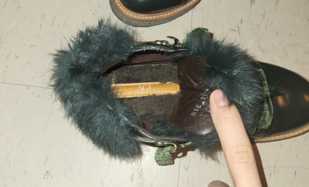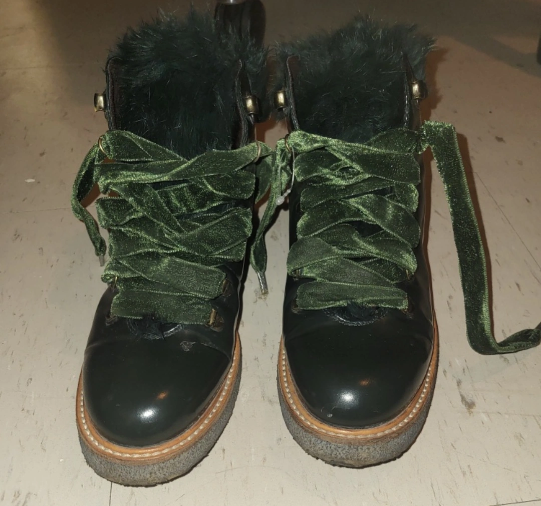 Women's dark green leather boots. Features faux fur trim and green velvet laces. Size 38.5.