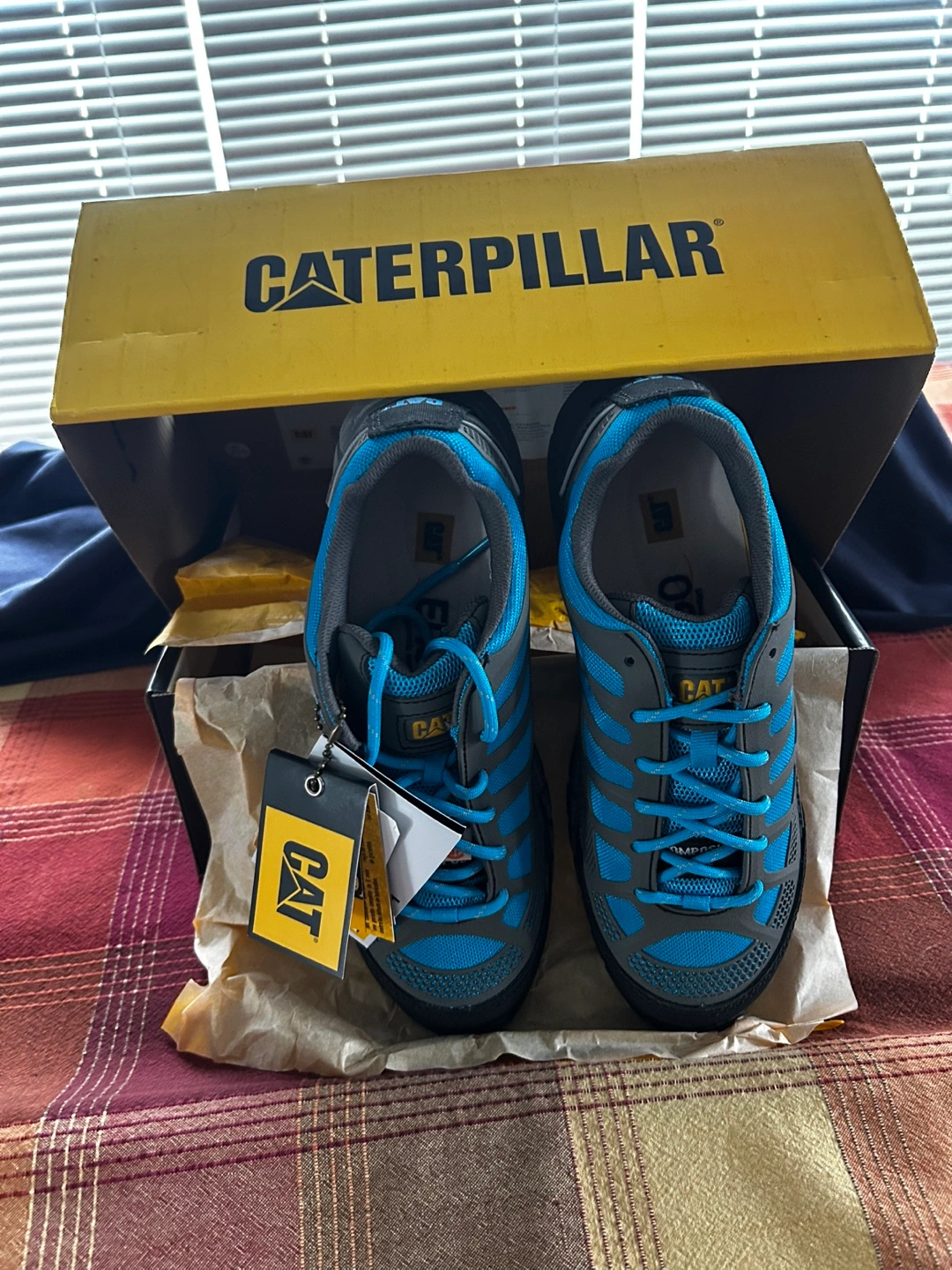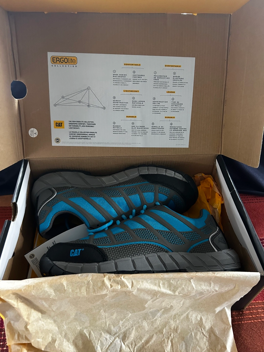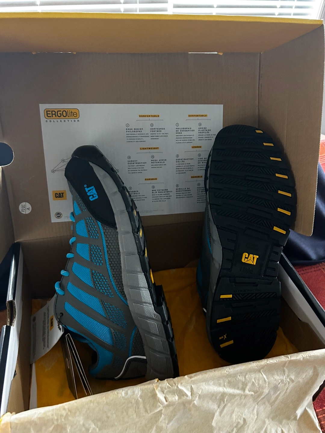 New Caterpillar ErgoLite collection safety shoes. Women's size 9. Blue and grey. CSA approved. In original box.