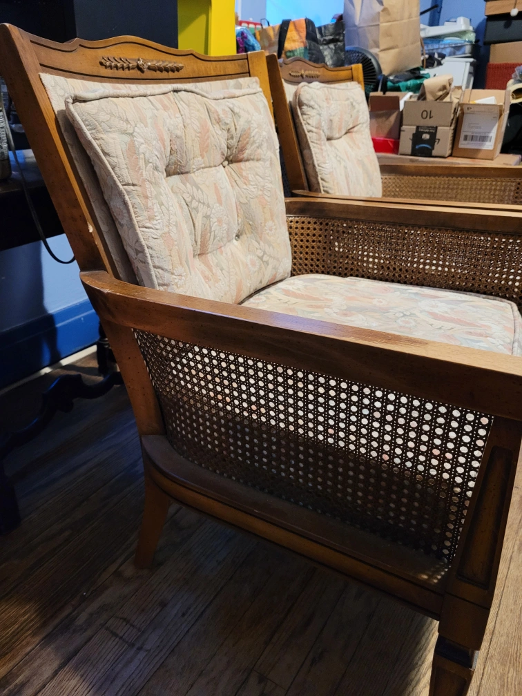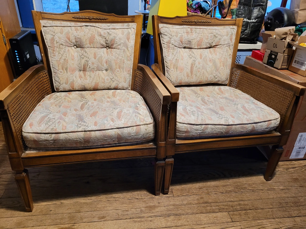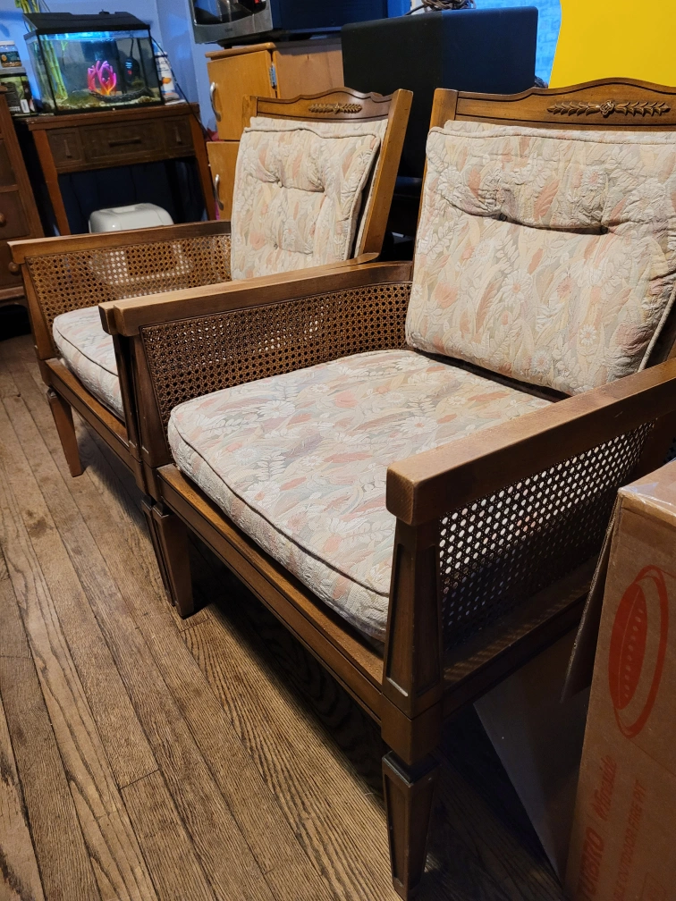 Two matching vintage chairs. Wooden frame with cane detailing. Floral patterned cushions with no stains. Perfect for a living room or den. Very comfortable. Pet friendly home. I love these chairs, but I have to move and downsize. Located in Rogerspark neighborhood. Make offer.