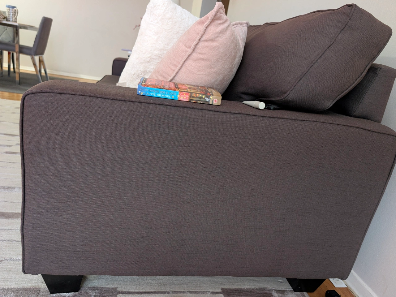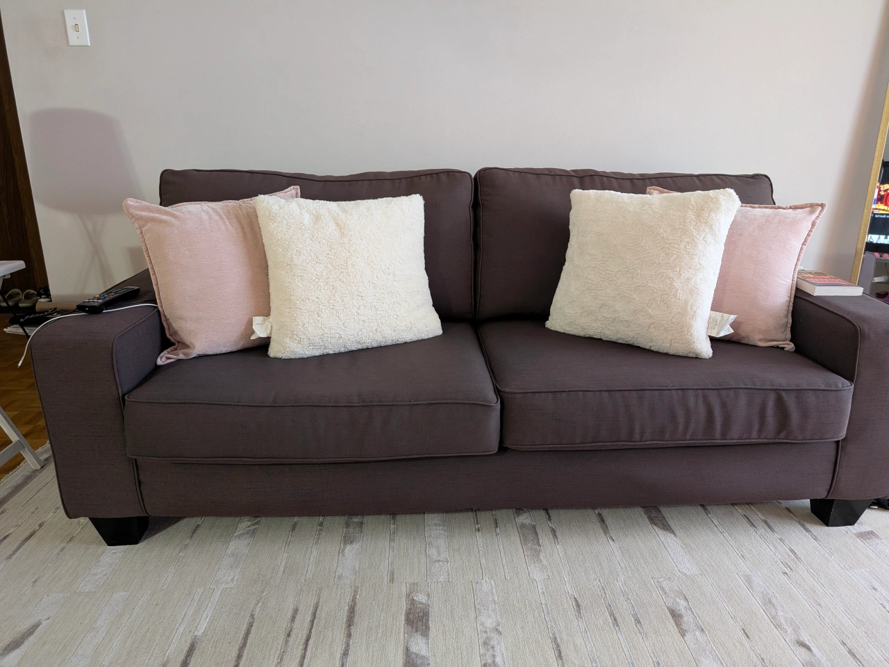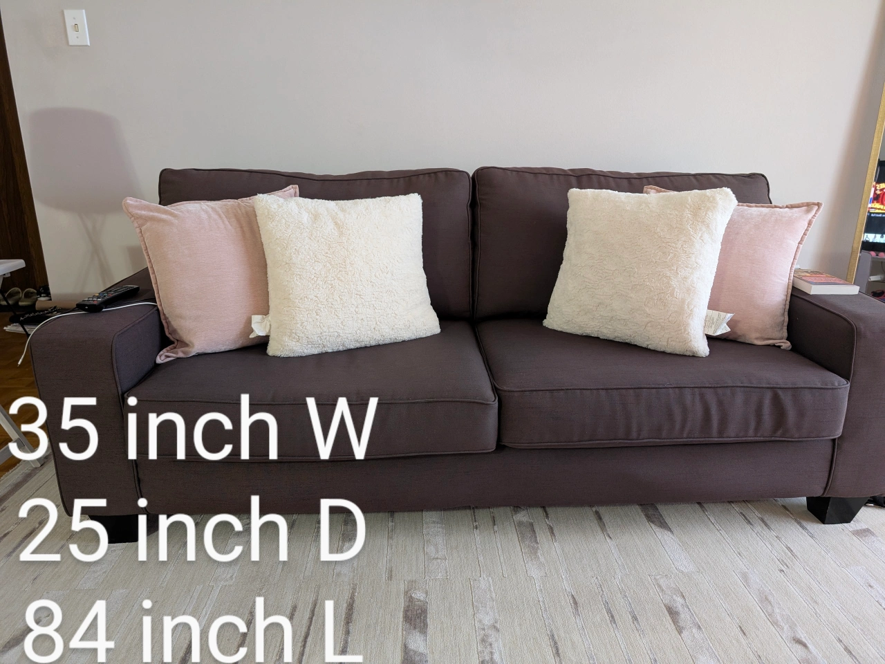 Comfortable couch. Dark gray fabric. Clean and well-maintained. Removable legs and seat covers for easy washing. Smoke free home. No pets.