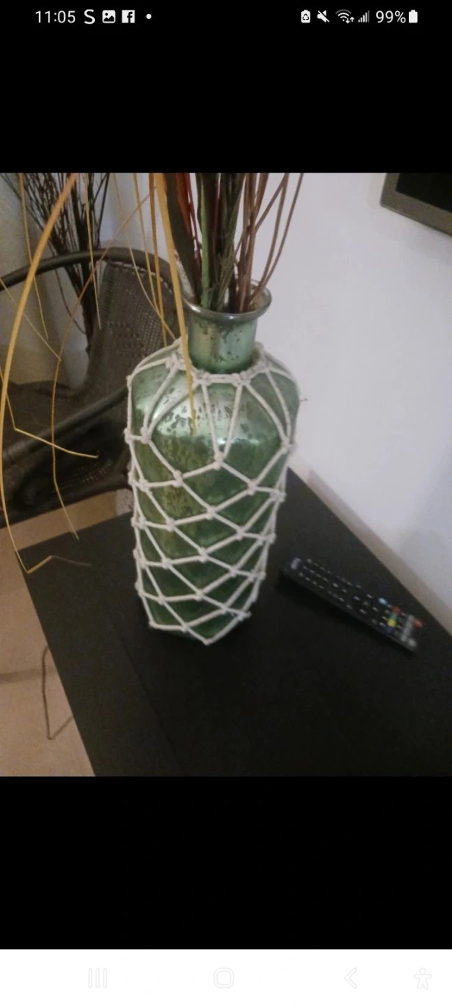 Green glass vase with a white rope netting detail. It's approximately 12 inches tall. Looks great with dried grasses or as a standalone piece!