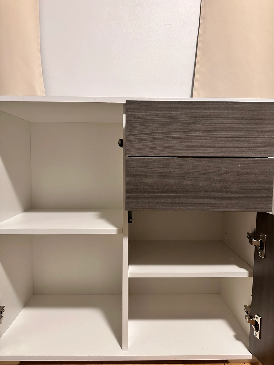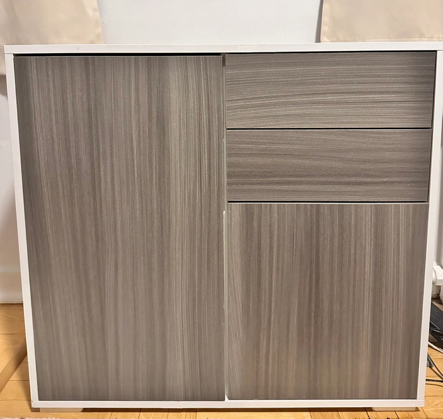 2 drawers, 2 door cabinet. Grey and white. Shelf height adjustable. Push to open design