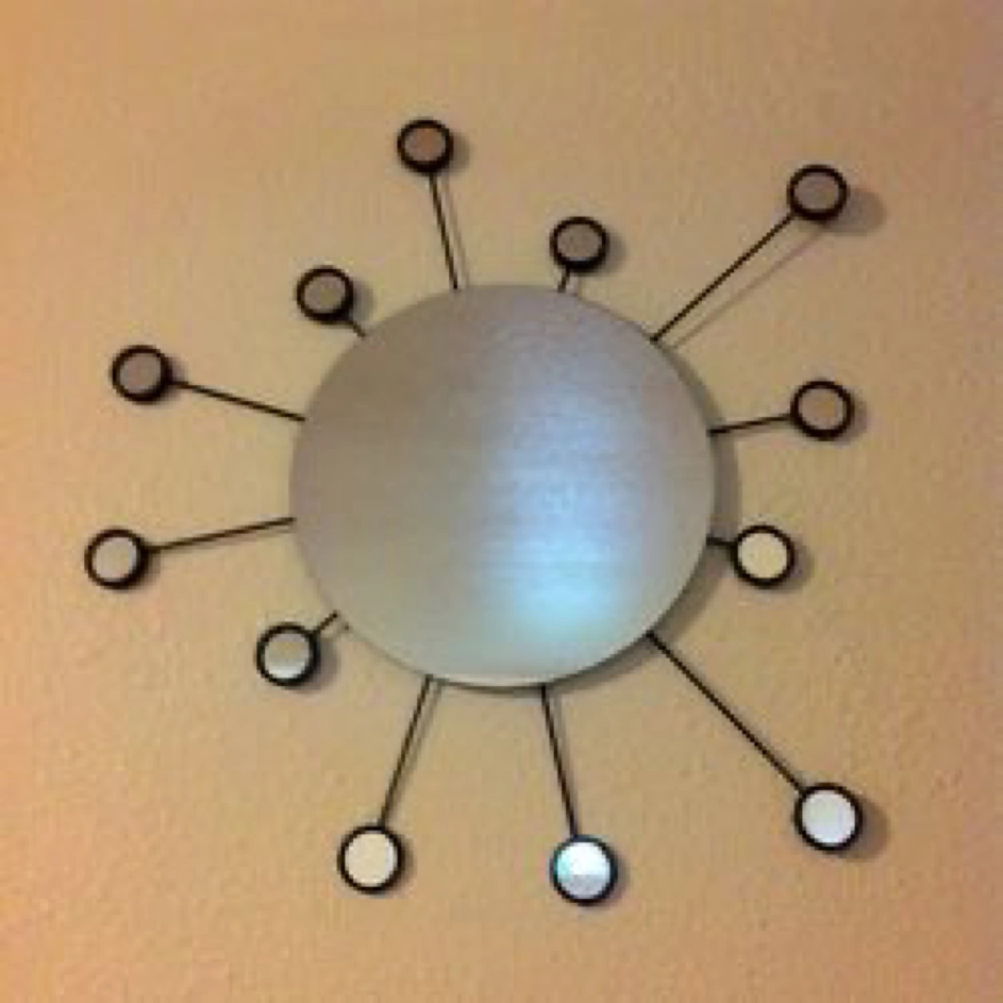Stylish IKEA Figgjo sunburst mirror. Features a large central mirror surrounded by smaller mirrors attached to thin black metal rods. Modern and eye-catching design.