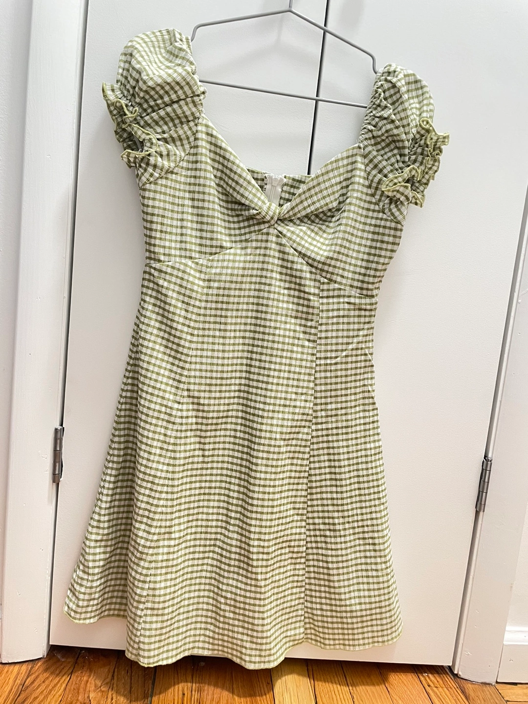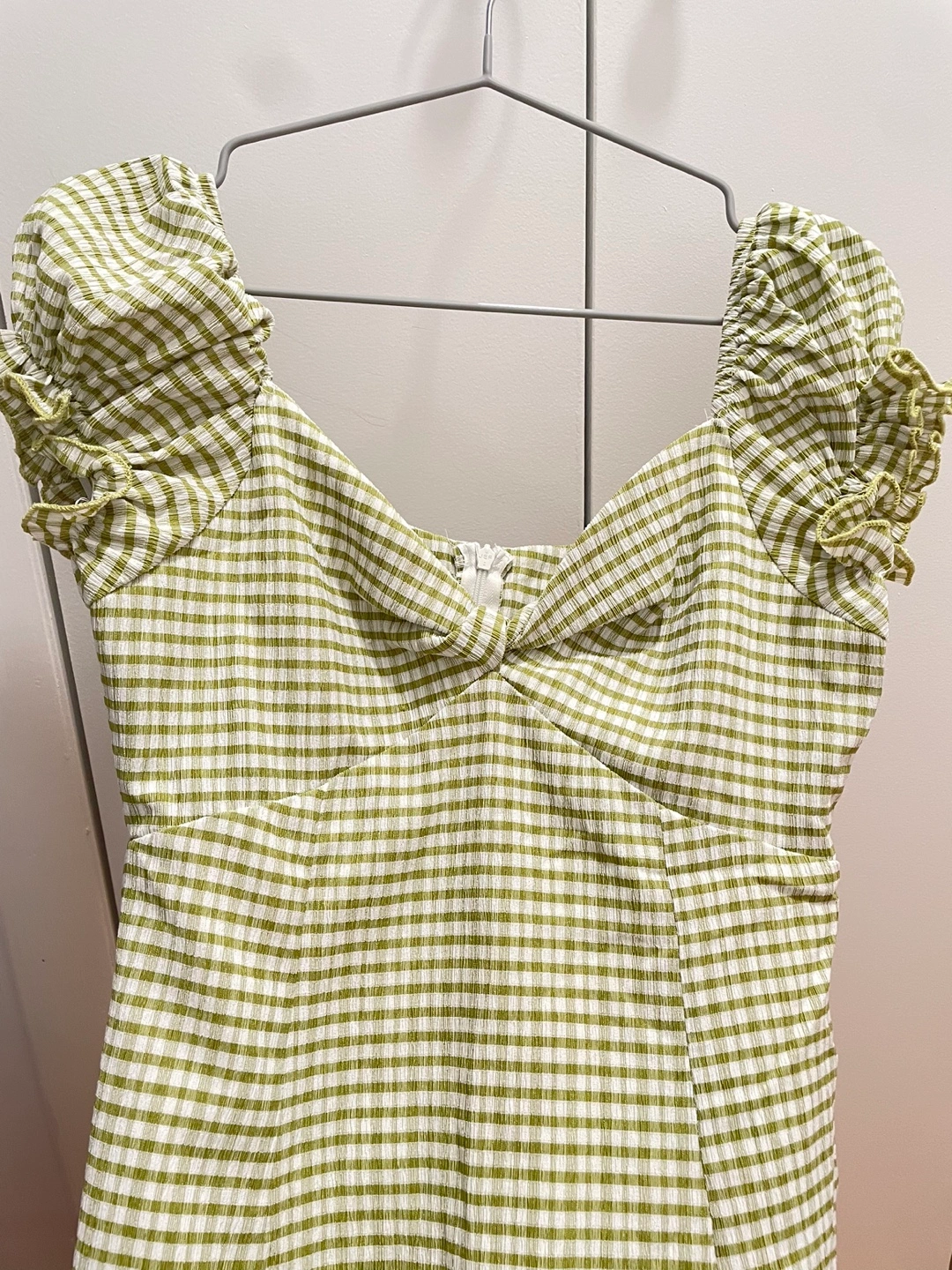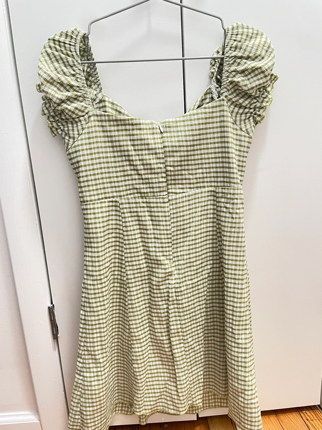 Adorable spring/summer mini dress. Green and white gingham print. Puff sleeves. Square neckline. Back zipper closure. Lightweight fabric. Perfect for spring or summer due to breathable material.
