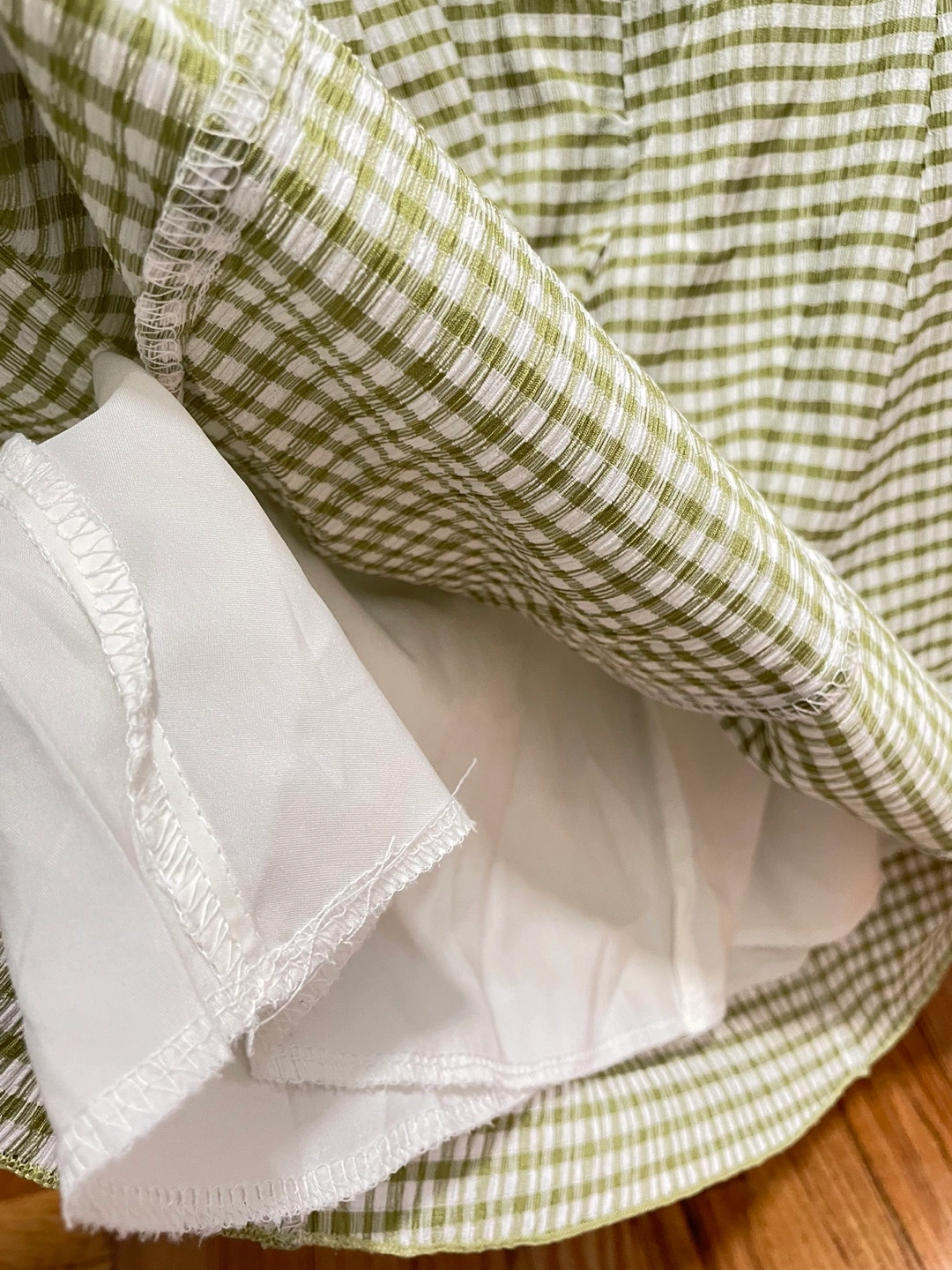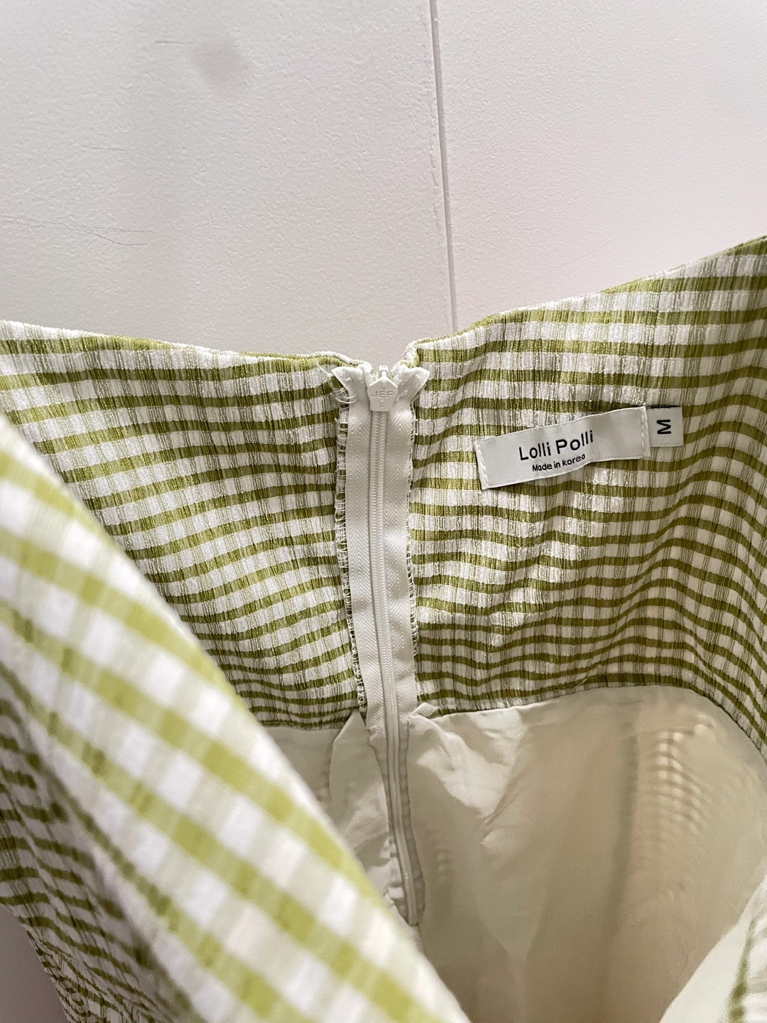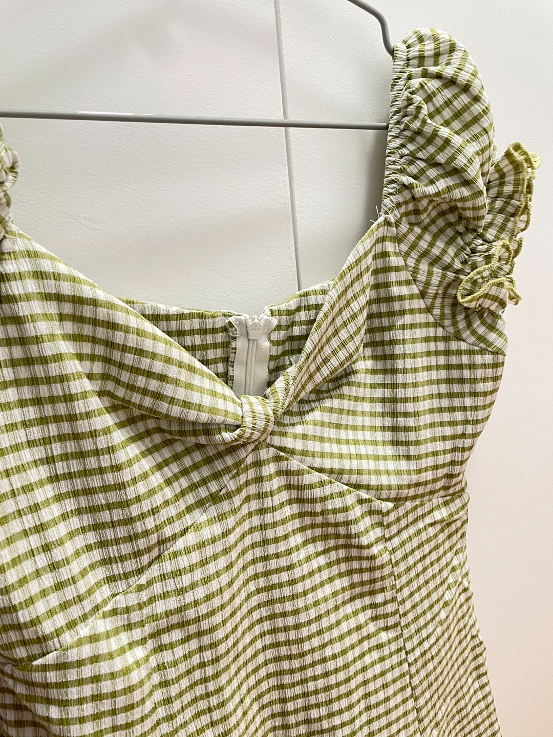 Adorable spring/summer mini dress. Green and white gingham print. Puff sleeves. Square neckline. Back zipper closure. Lightweight fabric. Perfect for spring or summer due to breathable material.