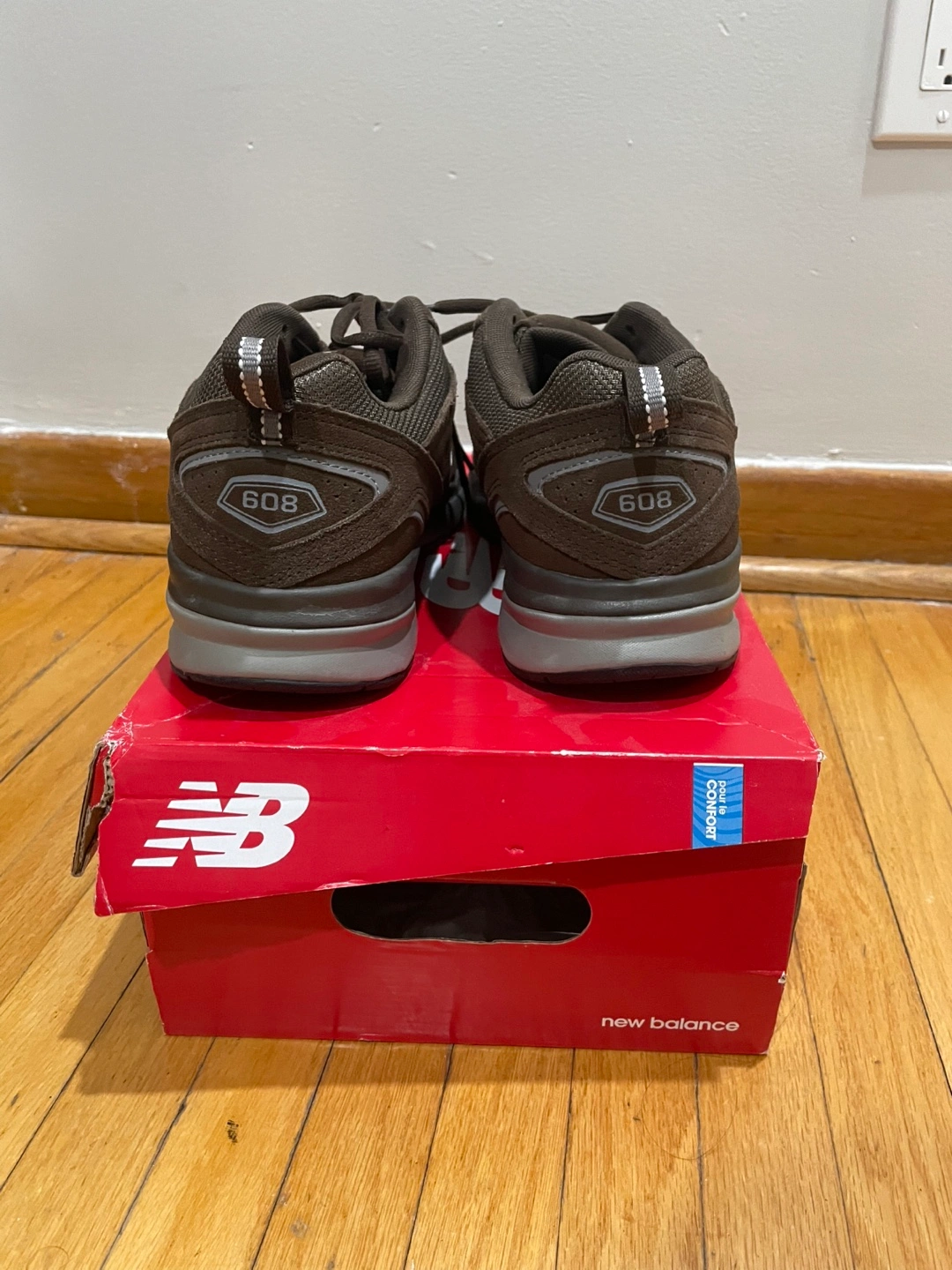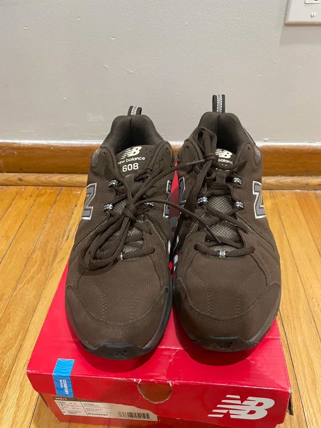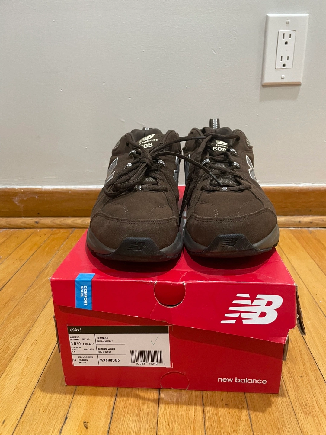 Men's New Balance 608v5 training shoes. Brown suede and mesh upper.