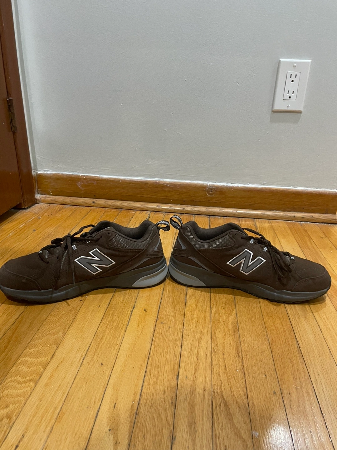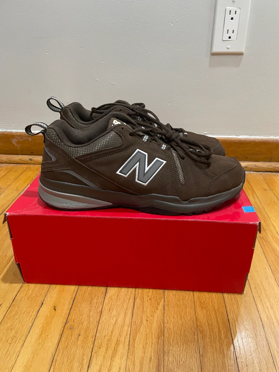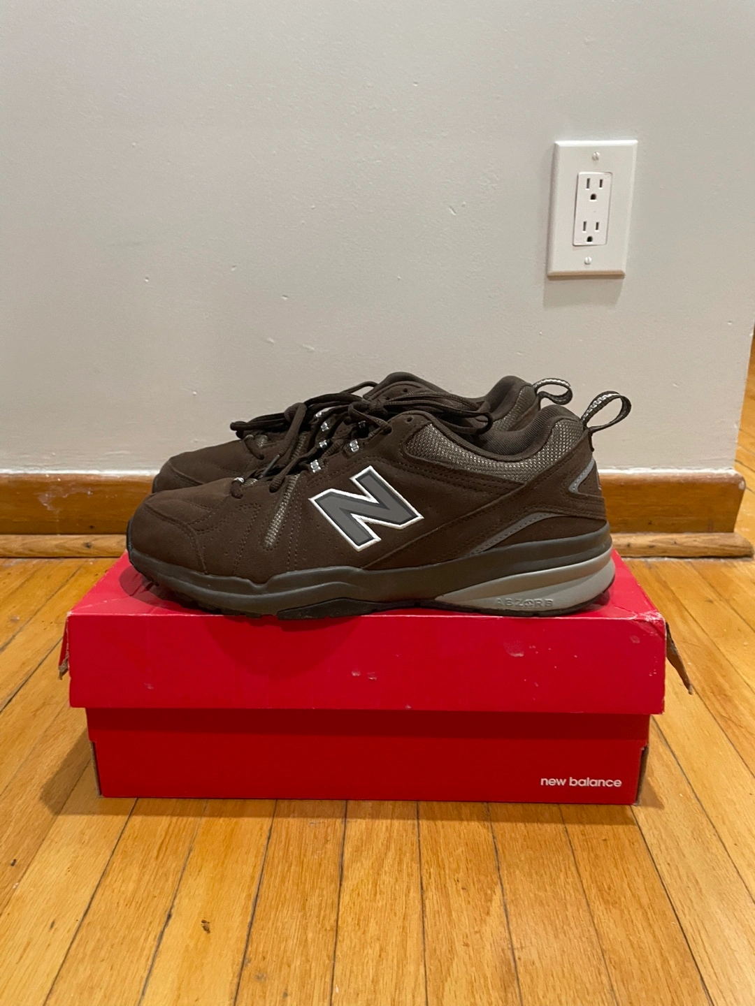 Men's New Balance 608v5 training shoes. Brown suede and mesh upper.